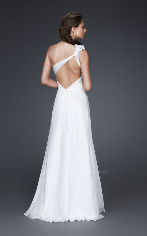 One shoulder silk chiffon gown with twisted gathering on front and back creates a great feature for this dress. Flower embellishments on the shoulder is an excellent touch.