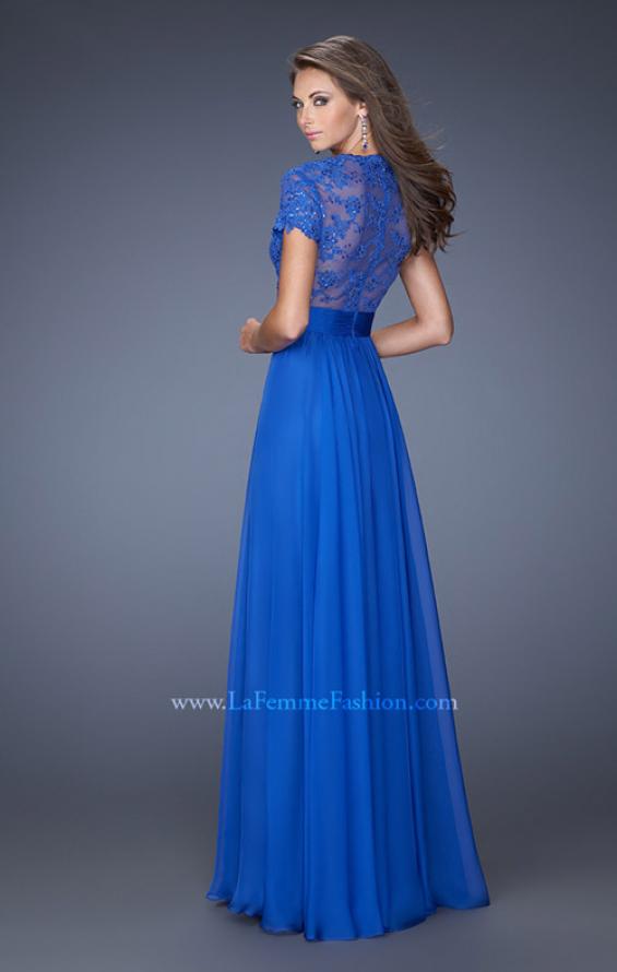 Magnificent A-line chiffon gown with a fitted waistband. The neckline is cut in a low V shape and adorned with lace. The back is covered in the same sheer lace fabric. Back zipper closure. Evening Collection Size Chart A.