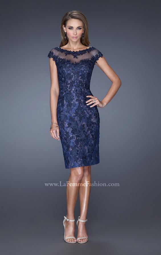 Elaborate two-toned lace dress with a keyhole back. The high scoop neckline features a sheer panel and lace trim. Back zipper closures. Evening Collection Size Chart A.