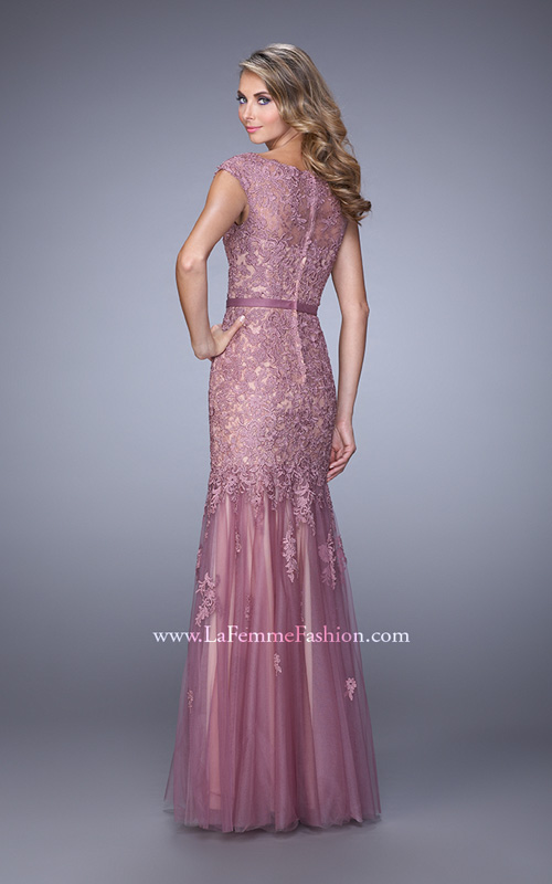 Alluring lace and tulle dress with sheer lace capped sleeves. The skirt is net, embellished with beaded lace appliques. Back zipper closure. Evening Collection Size Chart B.