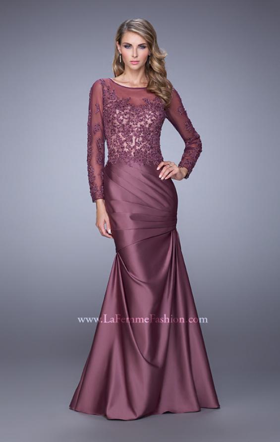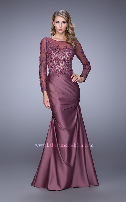 Unique satin dress with long sheer net sleeves. The bodice is encrusted with beaded lace appliques. Back zipper closure. Evening Collection Size Chart B.