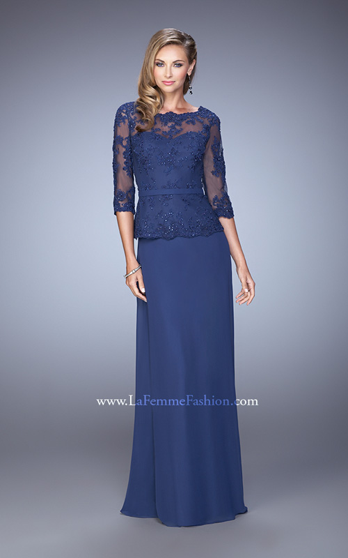Elegant crepe chiffon dress with sheer 3/4 length sleeves. The bodice is sheer lace with a peplum and belt at the waist. Back zipper closure. Evening Collection Size Chart B.