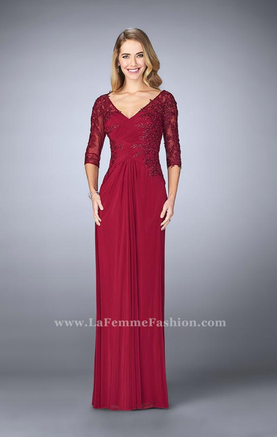 Graceful net jersey dress with criss cross gathers and lace accents on the bodice. The dress features sheer 3/4 length sleeves. Back zipper closure. Evening Size Chart B.