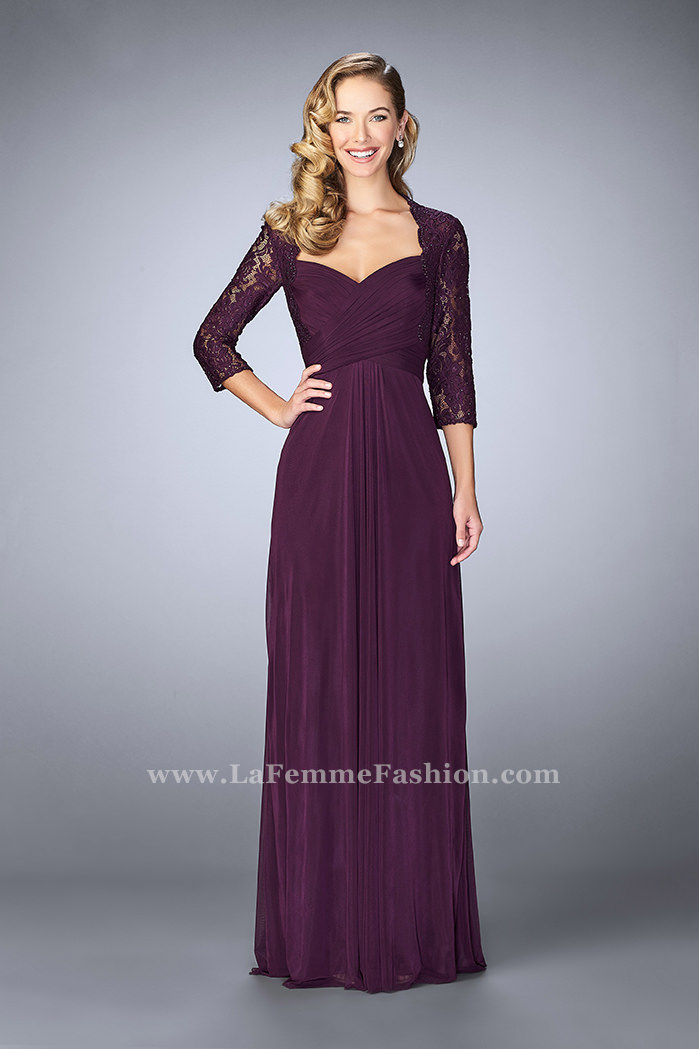 Charming net jersey gown with gathered bodice and sheer 3/4 length lace sleeves. Back zipper closure. Evening Collection Size Chart B.