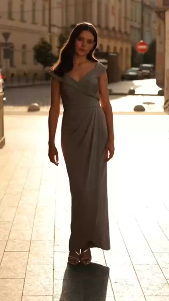 Modern jersey mother of the bride or mother of the groom dress with v- neckline and small cap sleeves. Soft ruching on the bodice and a left side slit complete this design. Back zipper closure.