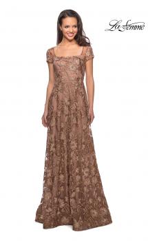 Long sequin mother of the bride or groom gown with sheer neckline and short sleeves. Back zipper closure.