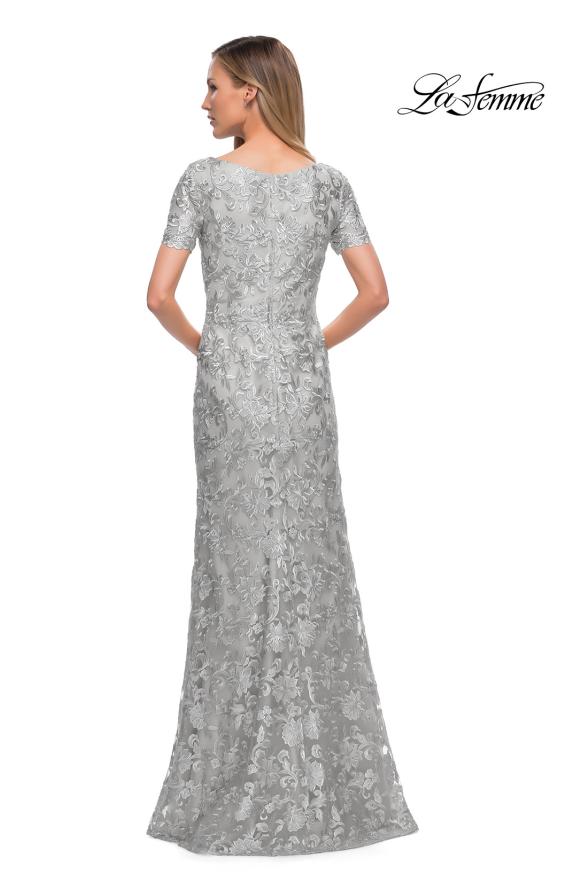 Gorgeous long lace gown with column skirt and high neckline. Sheer short sleeves that feature a scallop edging. Back zipper closure.