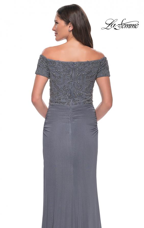 Exquisite net jersey gown with off the shoulder top and short sleeves. Beautiful beaded design on the back and sleeves. Back zipper closure.