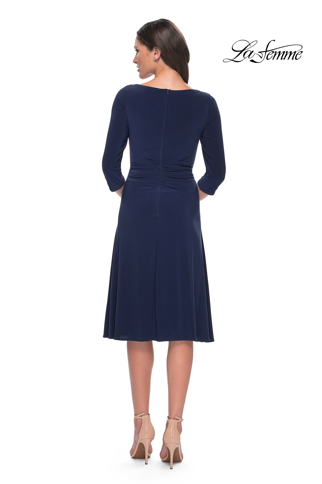 Simple jersey tea length dress with flare skirt. Ruching across waist, V neckline, and three-quarter sleeves. Back zipper closure.