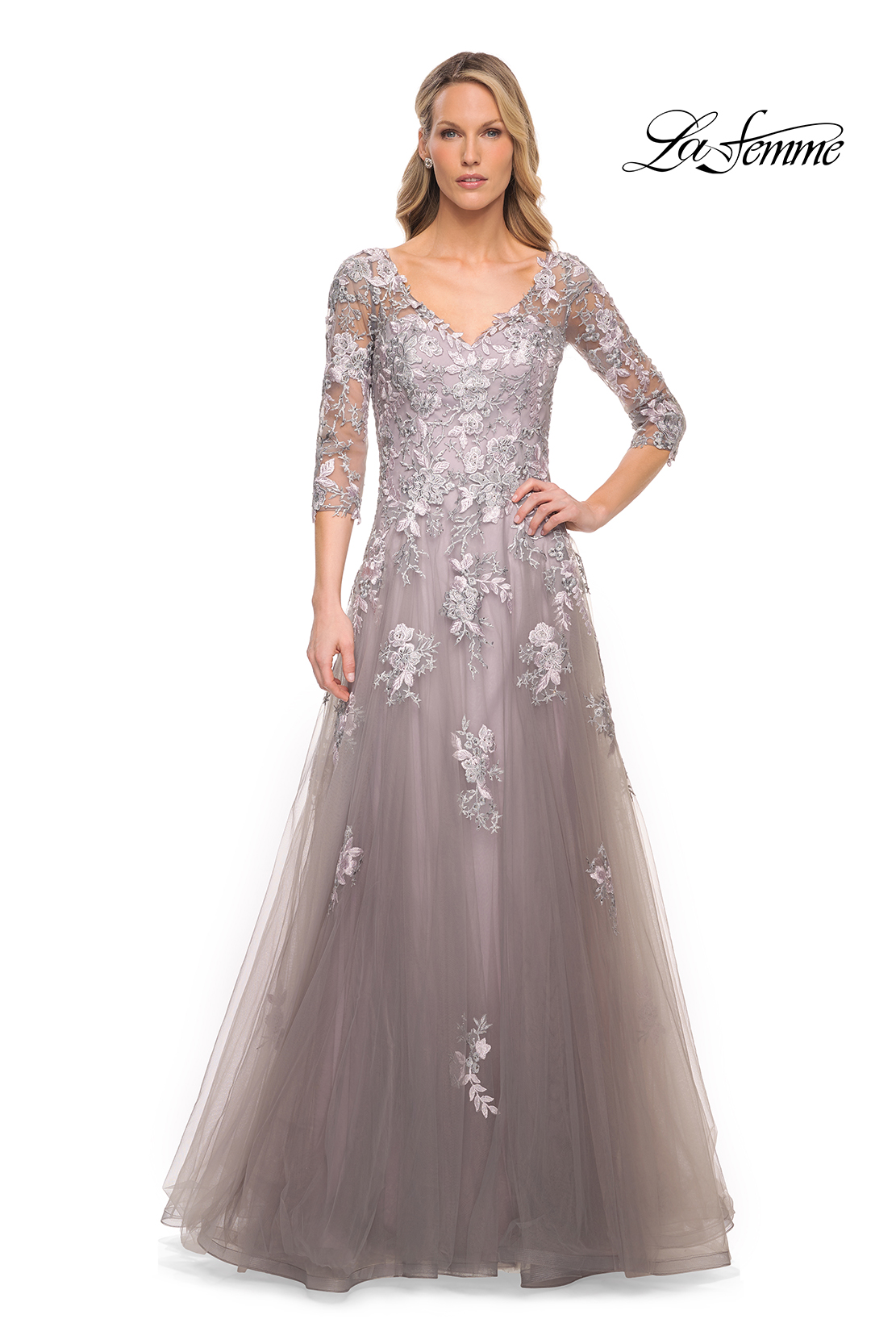 Three-quarter sleeve A-line tulle gown with V neckline. Illusion sheer sleeves and back. Back zipper closure.