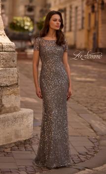 PREVIOUS STYLE NEXT STYLE LA FEMME 30323Size4 - 20 Size ChartColorNavySilver Share on FIND STORES NEAR MESequin off the shoulder below-the-knee gown with ruching. Back zipper closure.