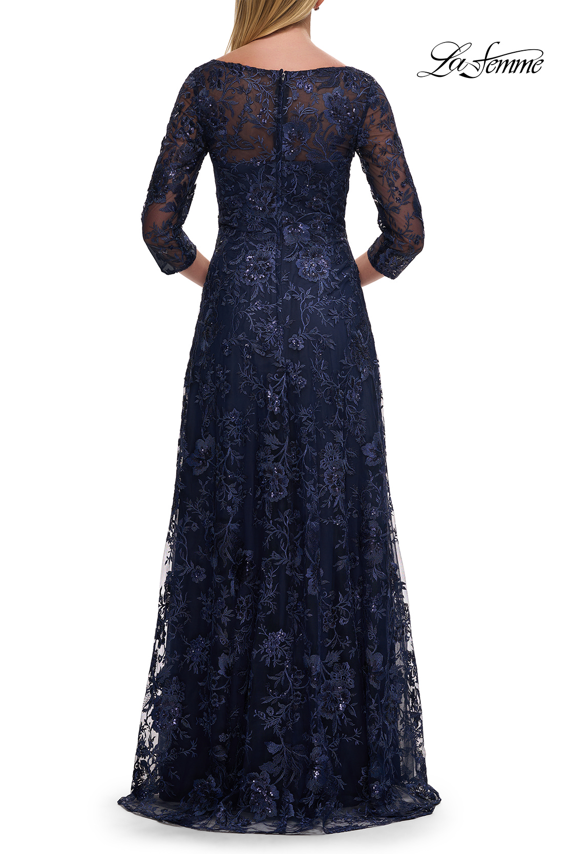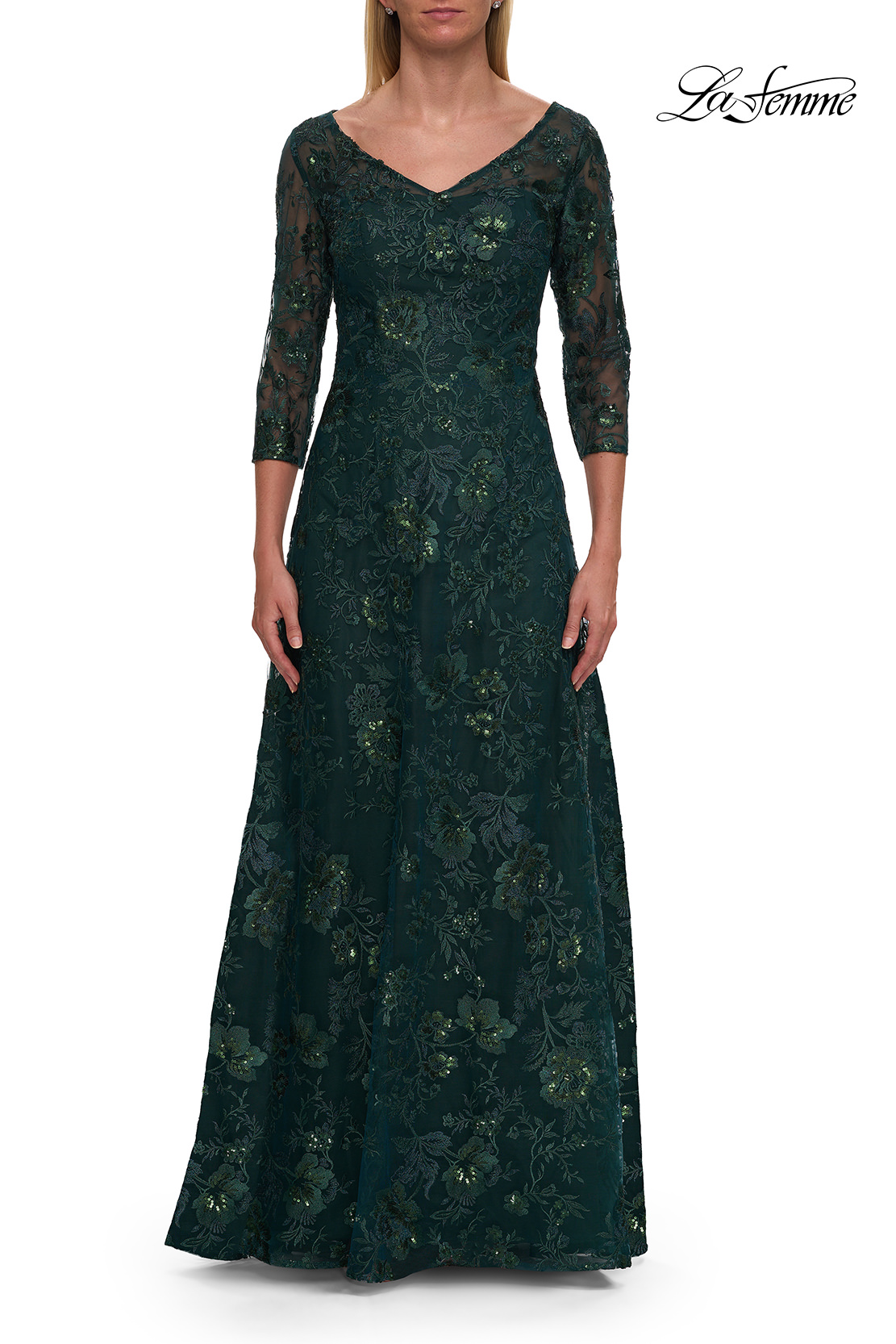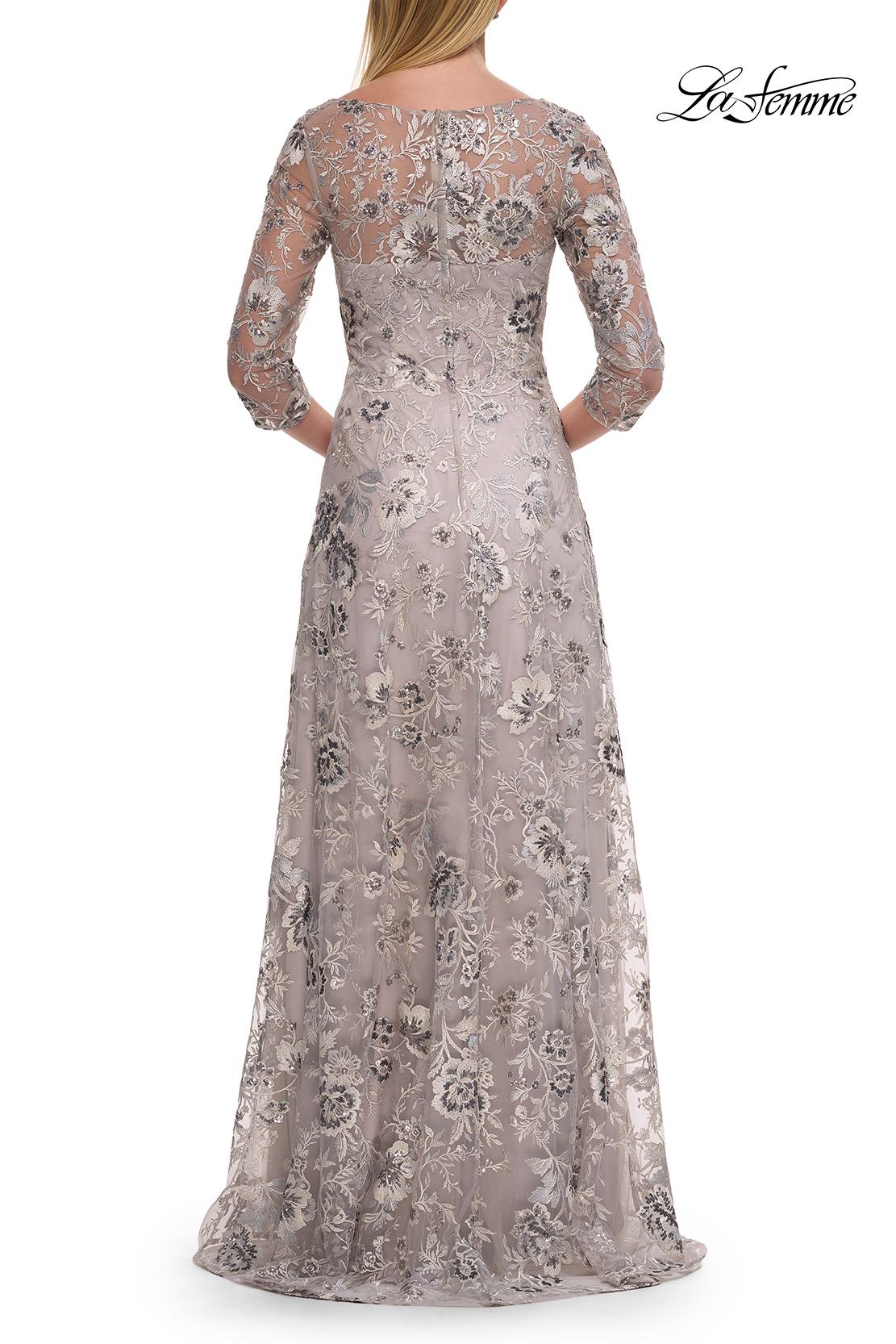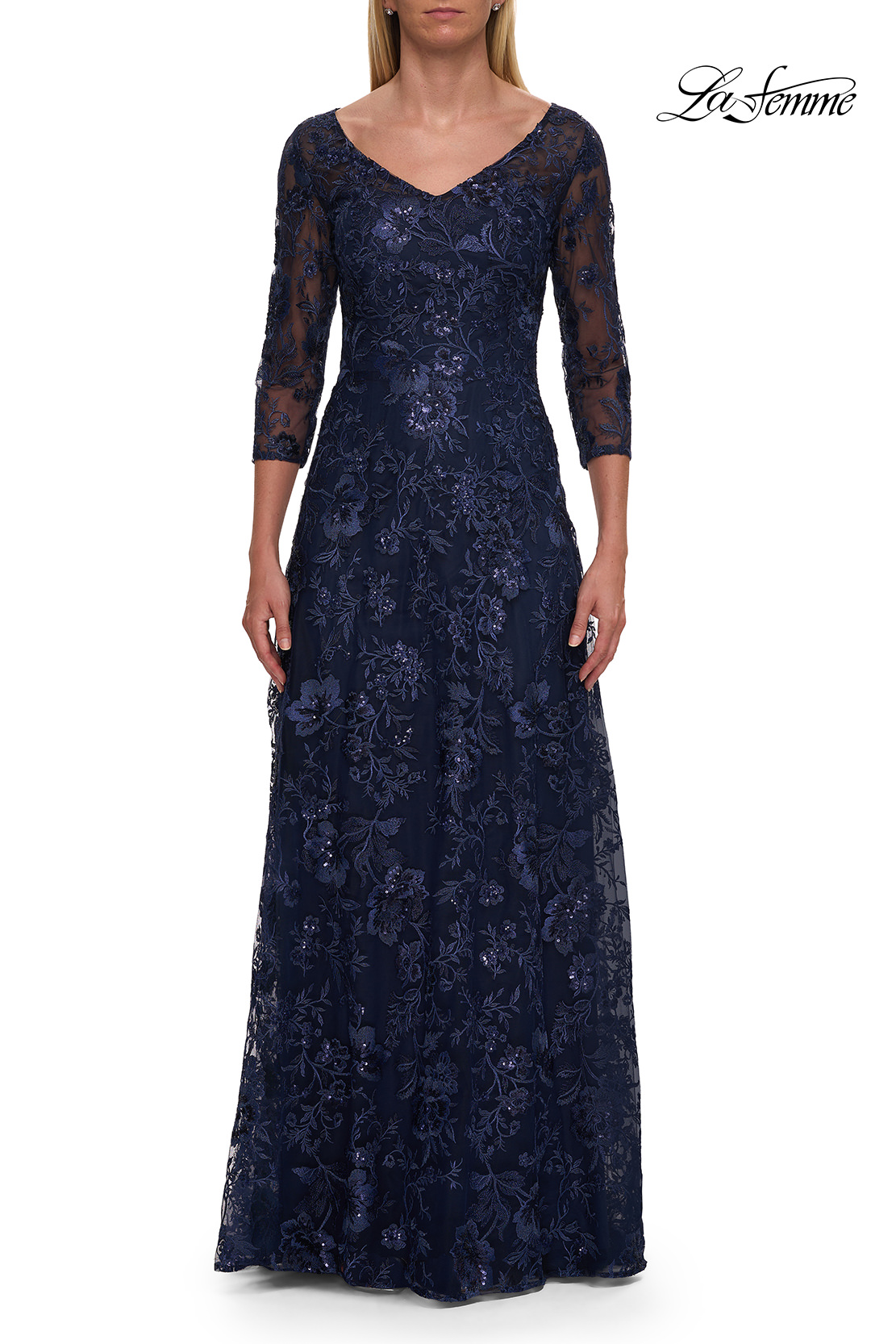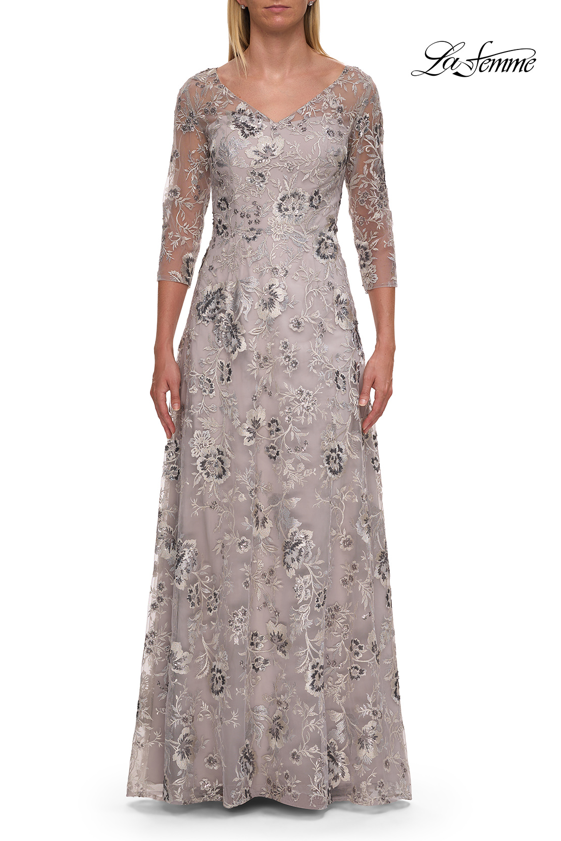 Floor length lace mother of the bride dress with a beautiful rose floral design. V neckline and sheer illusion three quarter sleeve. Back zipper closure.