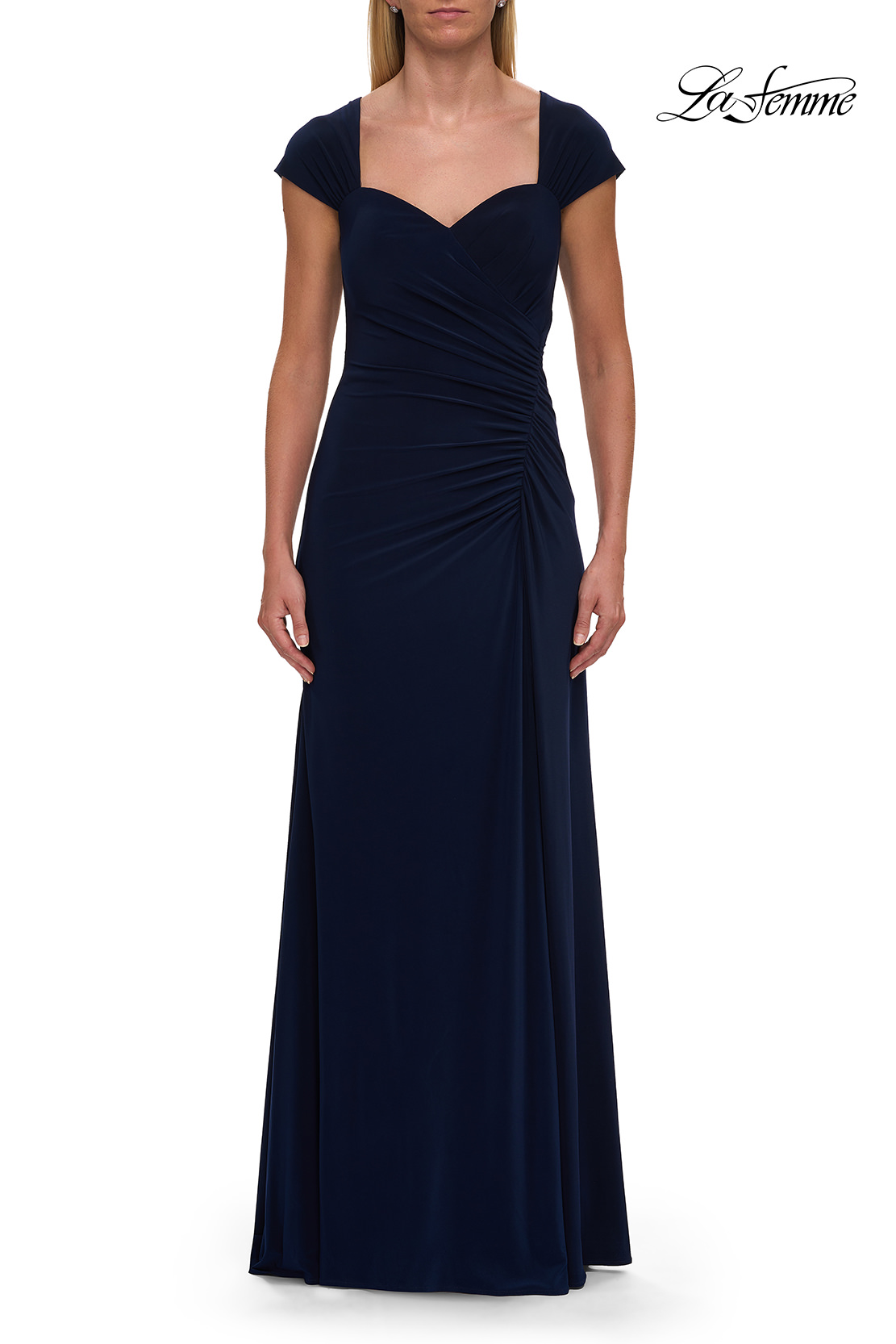 Simple jersey evening dress with a cap sleeve and sweetheart neckline. The waist features a ruching detail. Back zipper closure.