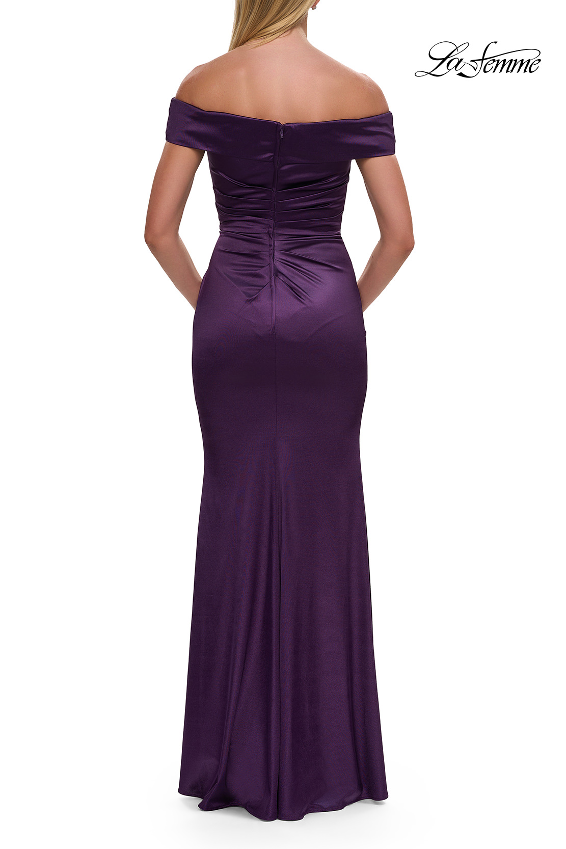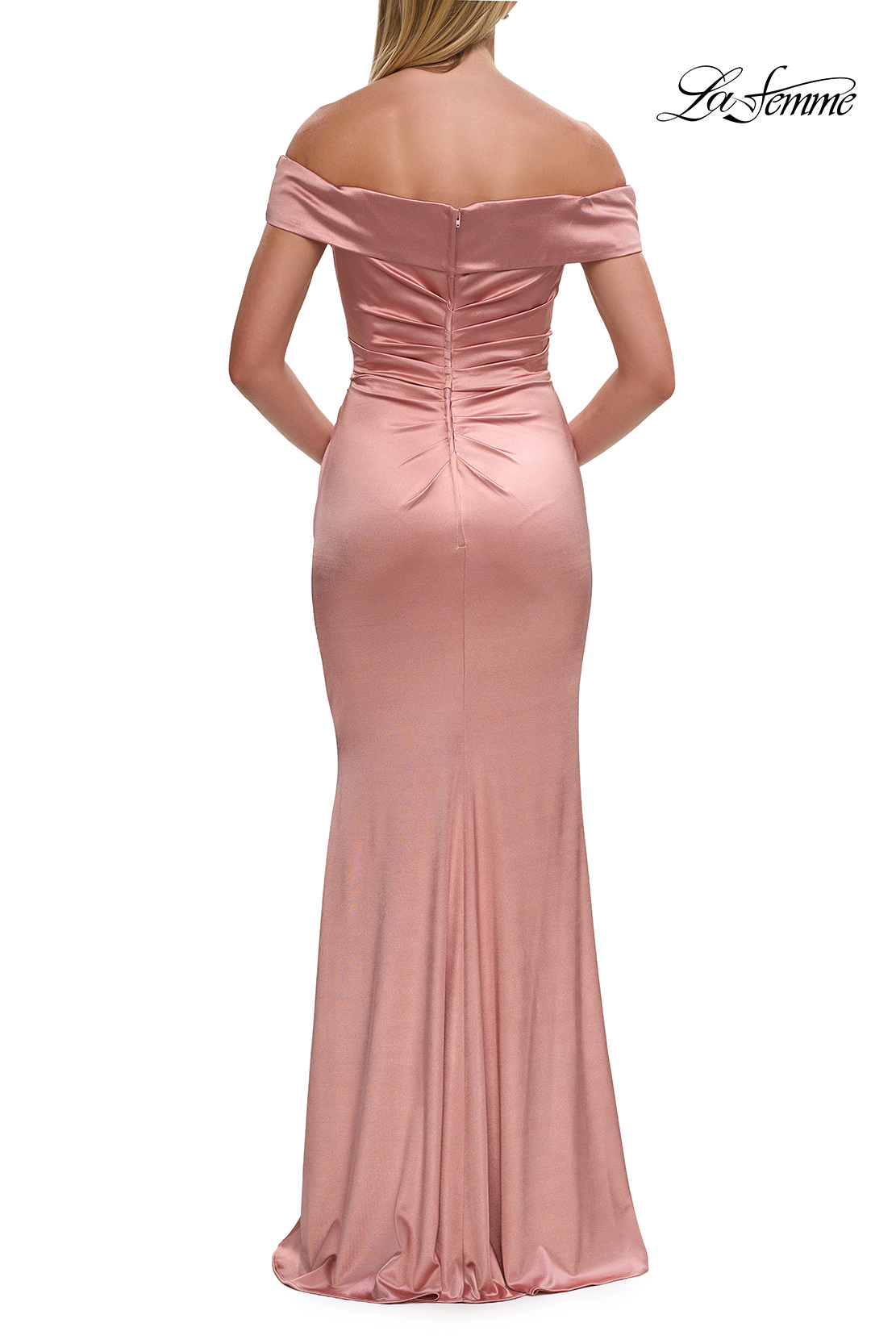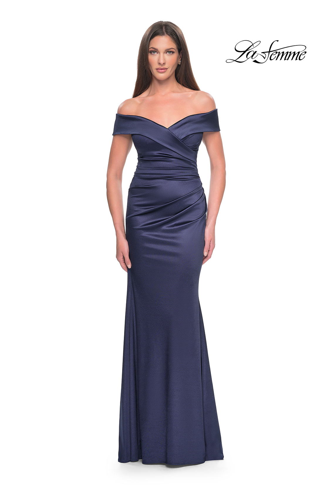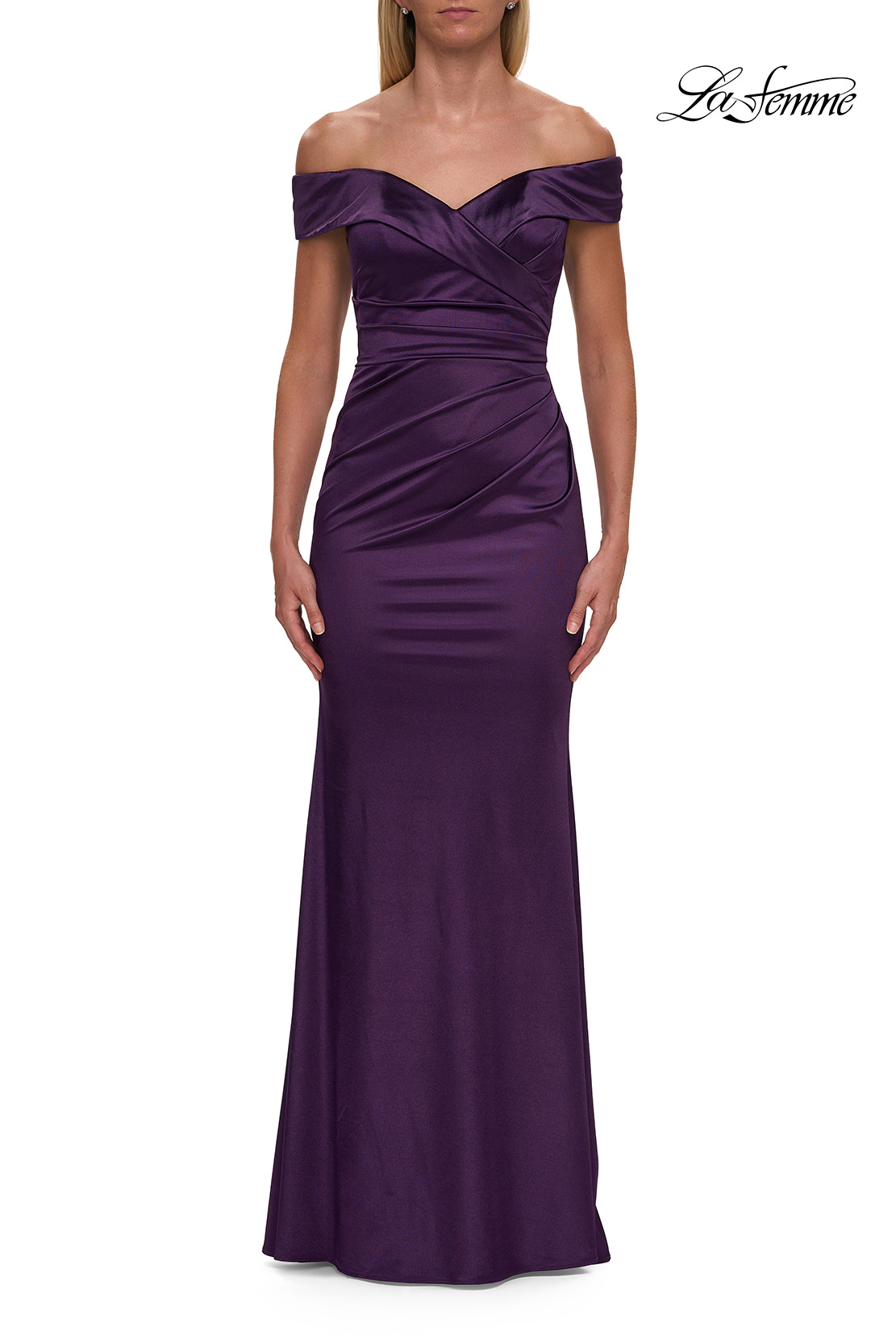 Chic stretch satin evening gown with off the shoulder top and flattering ruching throughout. Back zipper closure.
