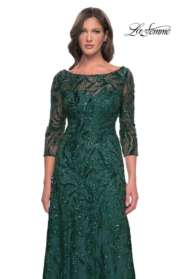 Fabulous beaded design gown with full skirt and illusion high neckline. Three quarter illusion beaded sleeves. Back zipper closure.