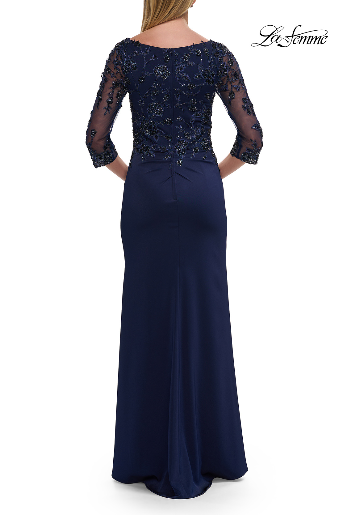 Long satin mother of the bride dress with beaded lace details on the bodice and three quarter sleeves. Back zipper closure.