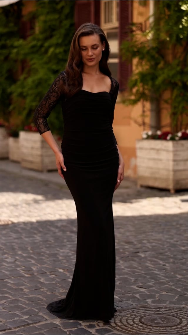 An elegant jersey gown featuring a softly ruched bodice and delicate lace illusion sleeves. The fitted silhouette flatters every curve, while the scalloped neckline and sheer lace back add timeless sophistication. Back zipper closure.