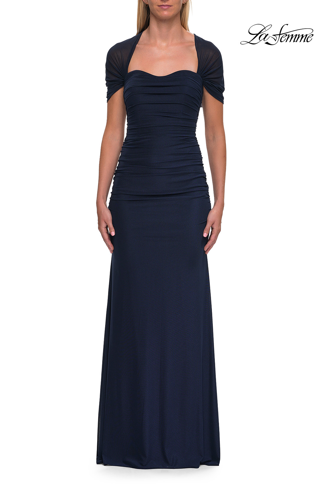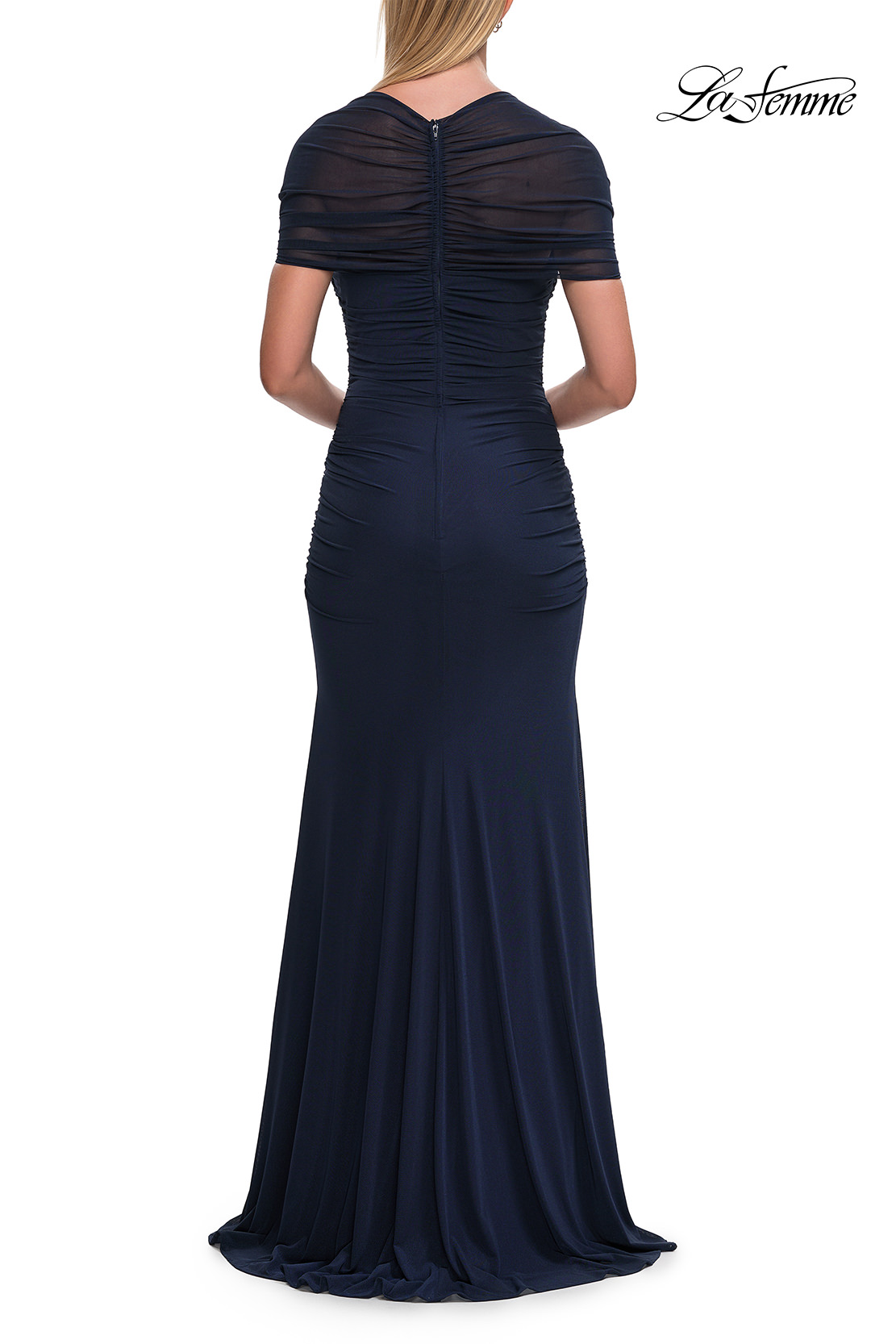 PREVIOUS STYLE NEXT STYLE LA FEMME 33153Size4 - 20 Size ChartColorEmeraldNavyTeal blue Share on FIND STORES NEAR MESimple long net jersey evening dress with gathering and short sleeves. Back zipper closure.