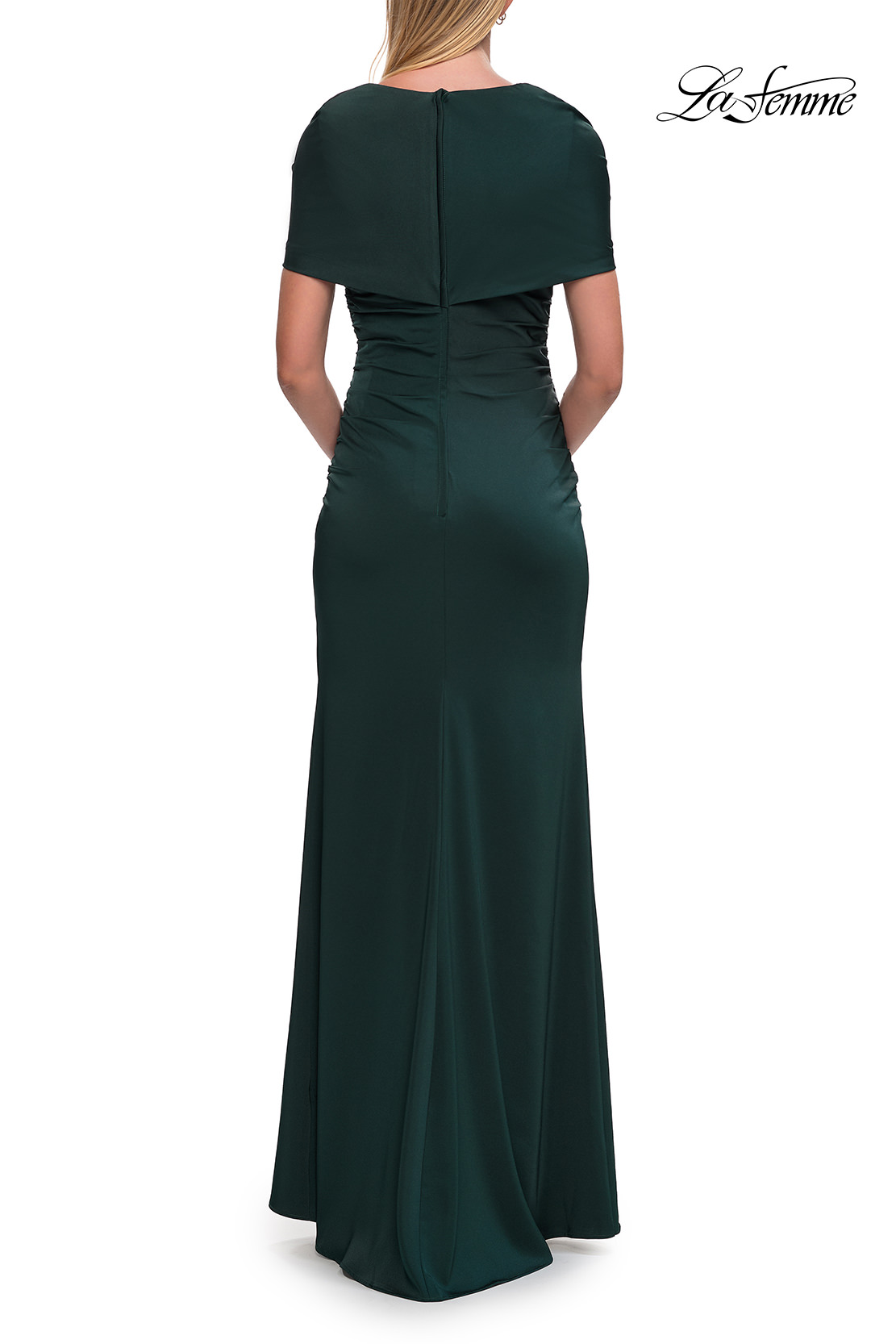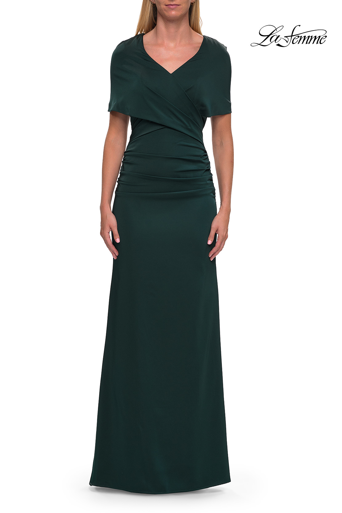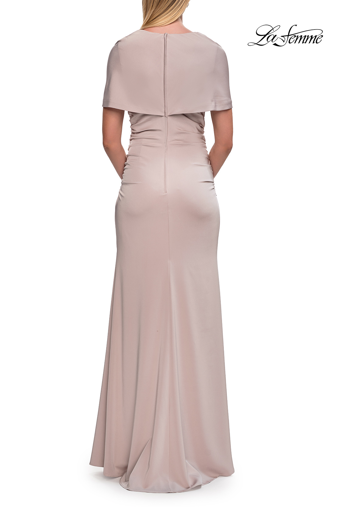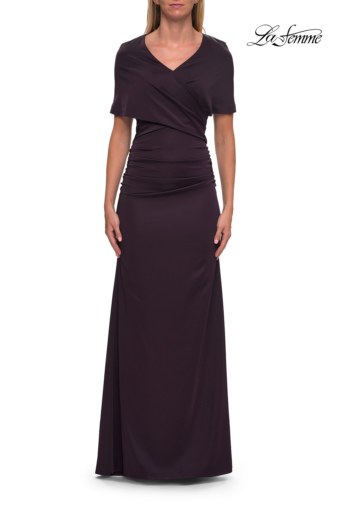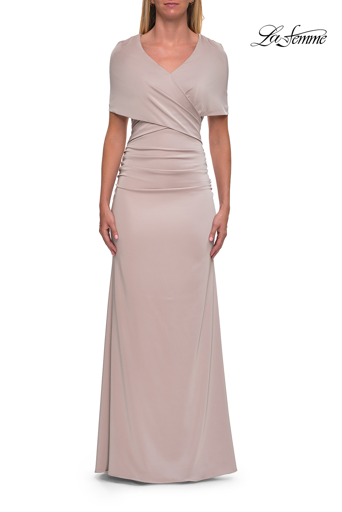 An elegant jersey gown featuring a beautifully draped bodice with a V-neckline and soft short sleeves. The smooth, fitted silhouette flatters the figure for a timeless and refined look—ideal for formal events or the modern mother of the bride. Back zipper closure.