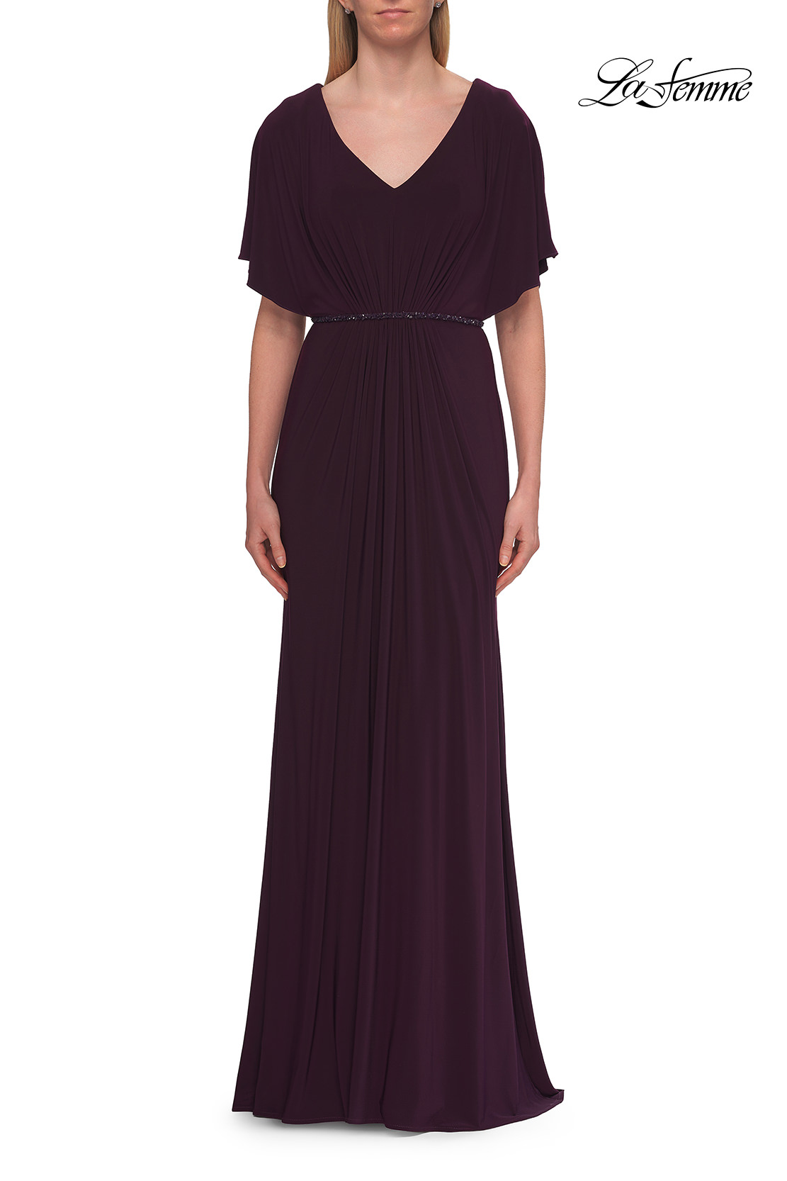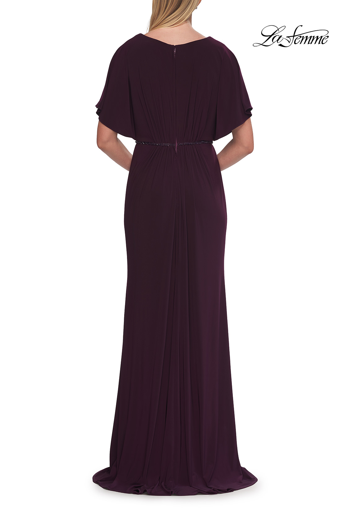 This elegant gown features soft flutter sleeves and a flattering V-neckline for a graceful silhouette. Gentle gathers at the bodice and skirt add subtle texture, while the beaded waistline provides a touch of shimmer and definition. A timeless design perfect for evening events or special occasions. Back zipper closure.