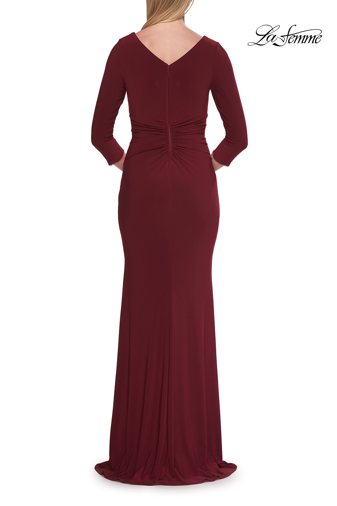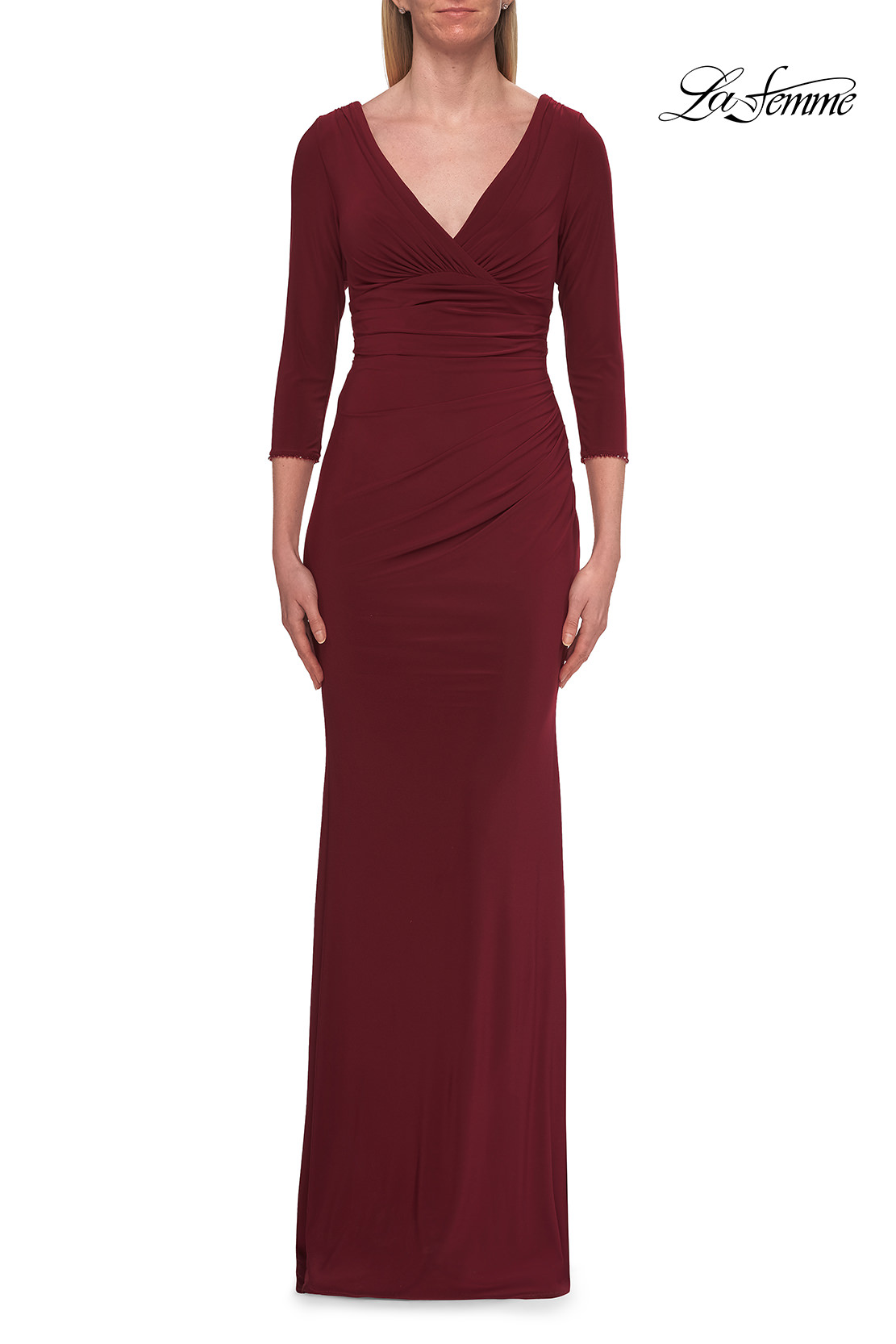 This timeless gown showcases a flattering V-neckline and elegant three-quarter sleeves with small beading detail. Soft ruching enhances the waist and hips for a beautifully sculpted silhouette, while the smooth jersey fabric drapes effortlessly to the floor—perfect for evening occasions or formal celebrations. Back zipper closure.