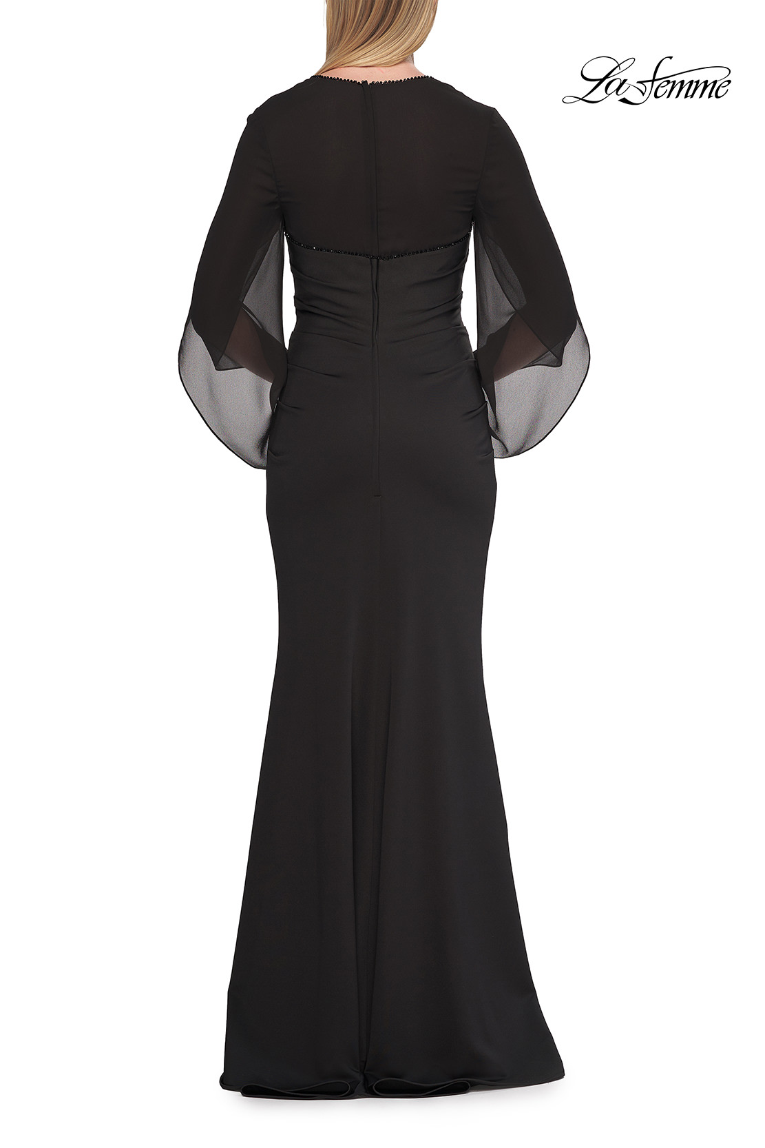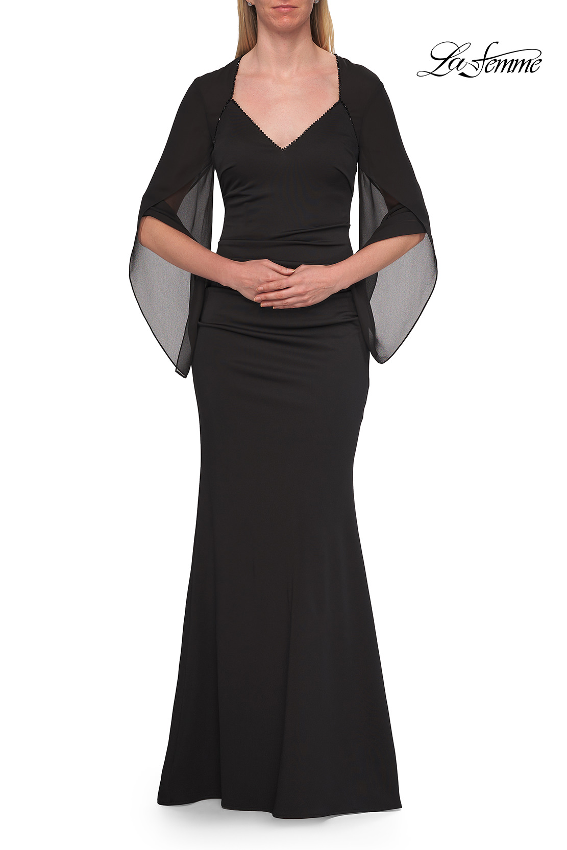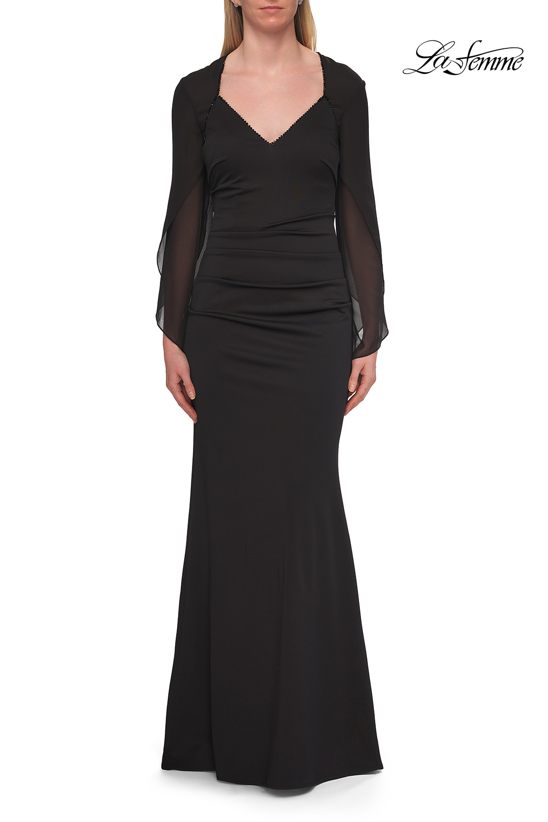 A graceful gown designed with a soft V-neckline and flowing chiffon flutter sleeves that add a touch of romantic movement. The fitted bodice features flattering ruching for a sculpted silhouette, while subtle embellishments trace the neckline and back for a refined finish. Back zipper closure.