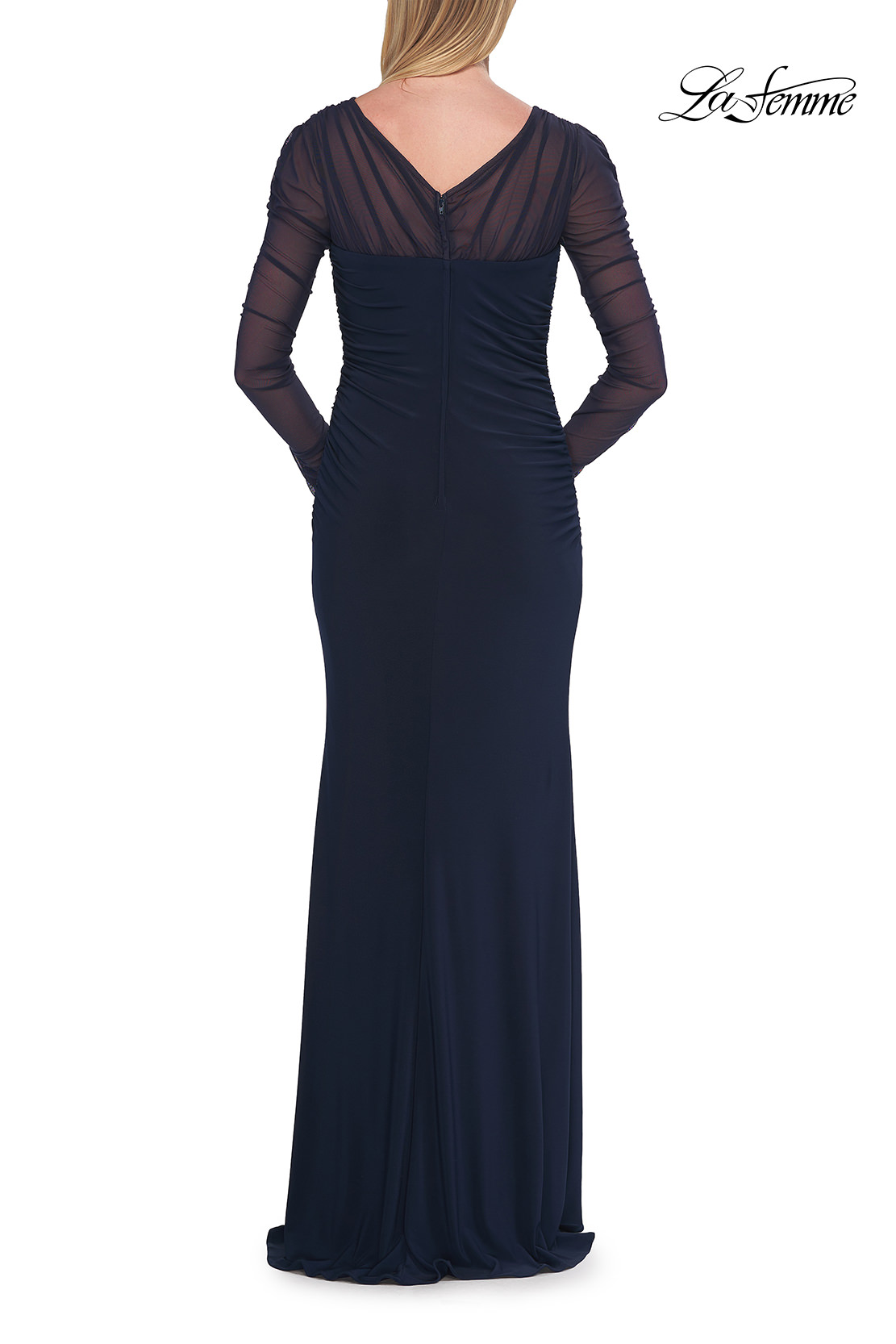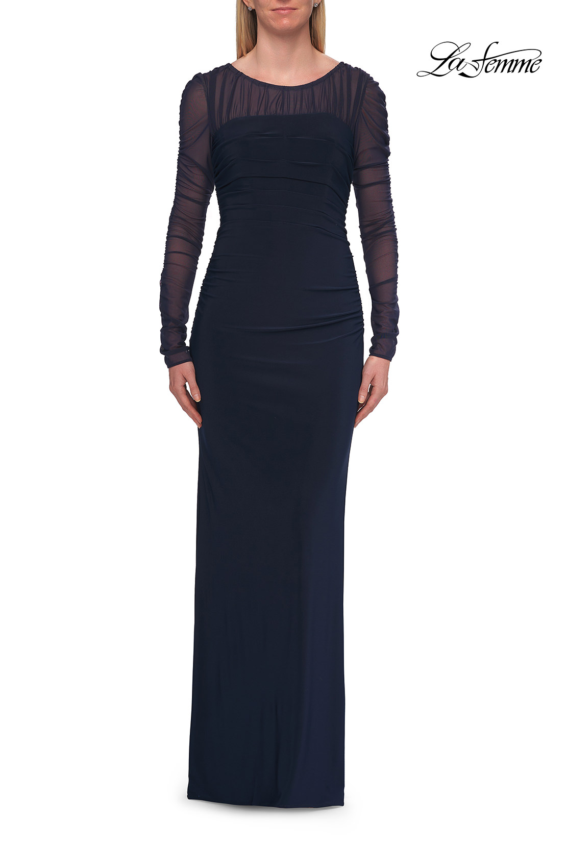 A timeless full-length gown featuring sheer mesh long sleeves and delicate ruching throughout the bodice for a flattering, feminine silhouette. The bateau neckline adds sophistication, while the fitted jersey skirt flows into a gentle flare, creating a graceful look perfect for evening events or formal celebrations. Back zipper closure.