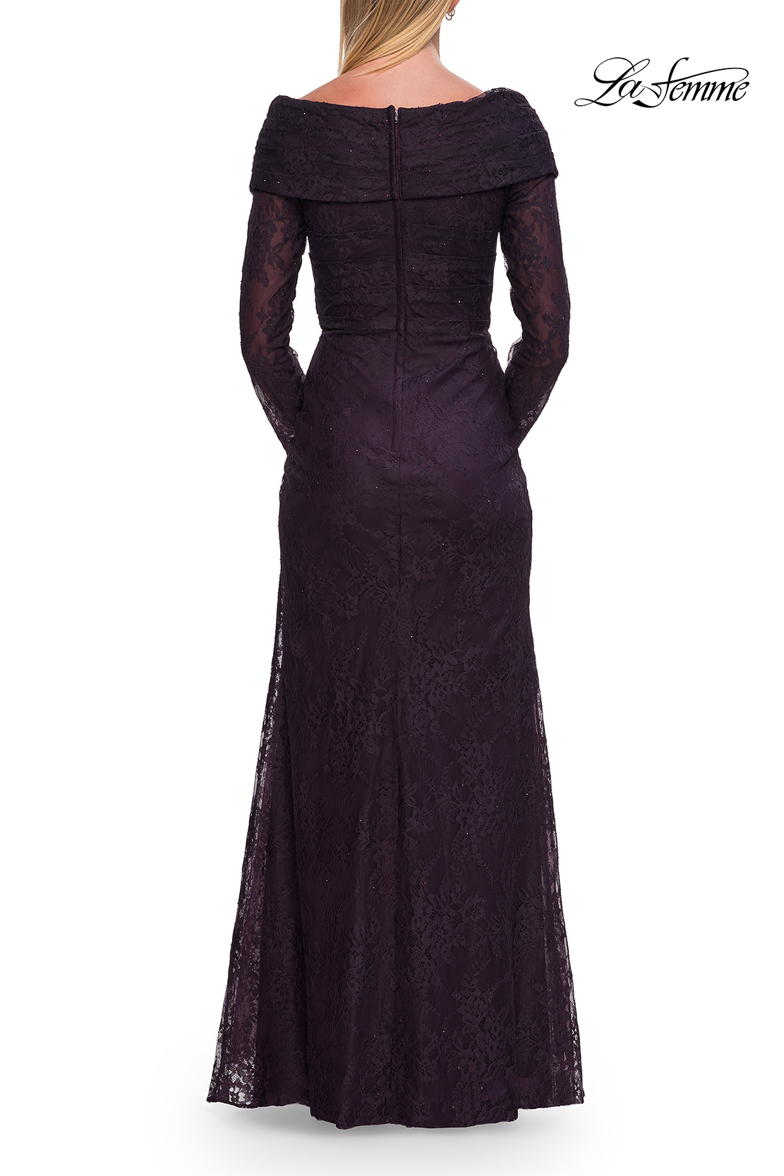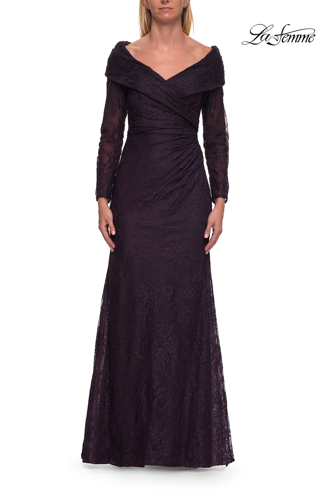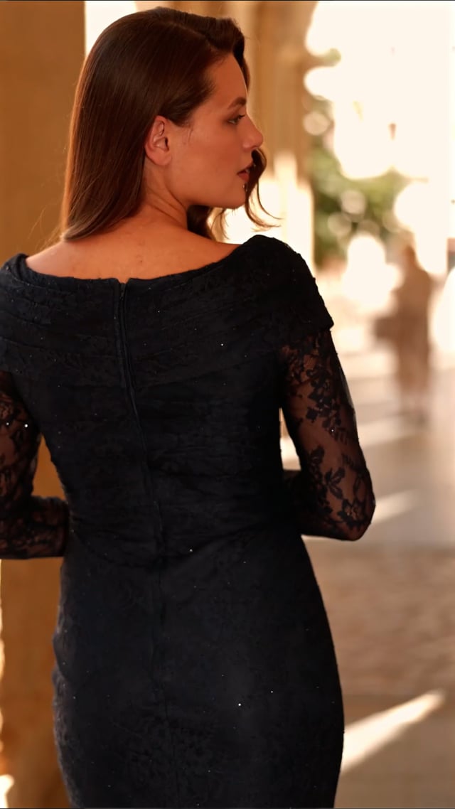 A refined lace evening gown designed with an elegant V-neckline and sheer long sleeves. The fitted bodice features delicate crossover detailing, flowing into a soft, floor-length skirt. Back zipper closure.