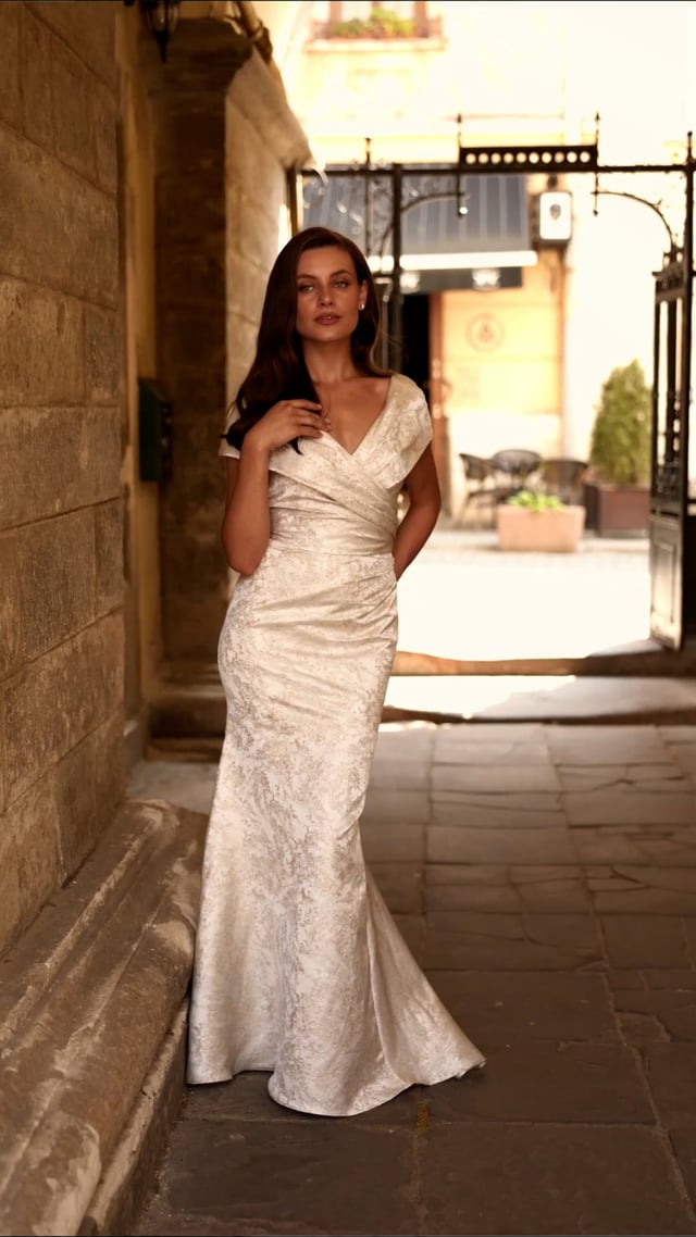 A timeless jacquard evening gown featuring an elegant off-shoulder neckline with a folded collar detail. The figure-flattering silhouette is enhanced by soft ruching through the waist and a graceful flared skirt. Back zipper closure.