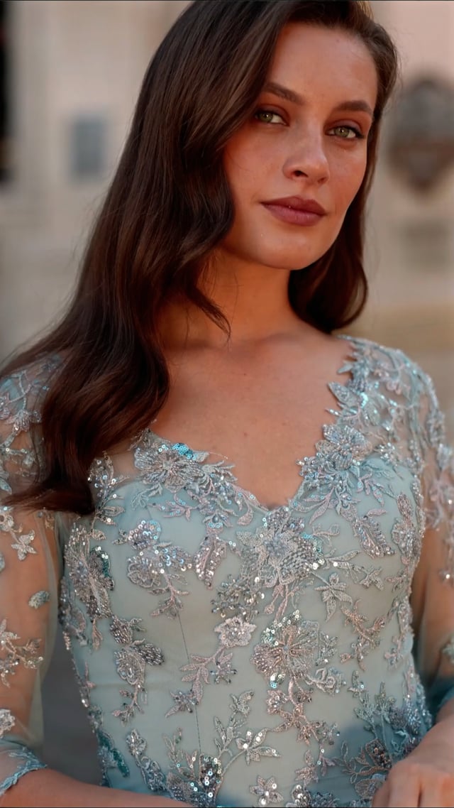 A romantic A-line gown adorned with delicate floral embroidery and shimmering beadwork. The illusion V-neckline and sheer three-quarter sleeves add an ethereal touch, while the soft tulle skirt flows beautifully with every step. Back zipper closure.