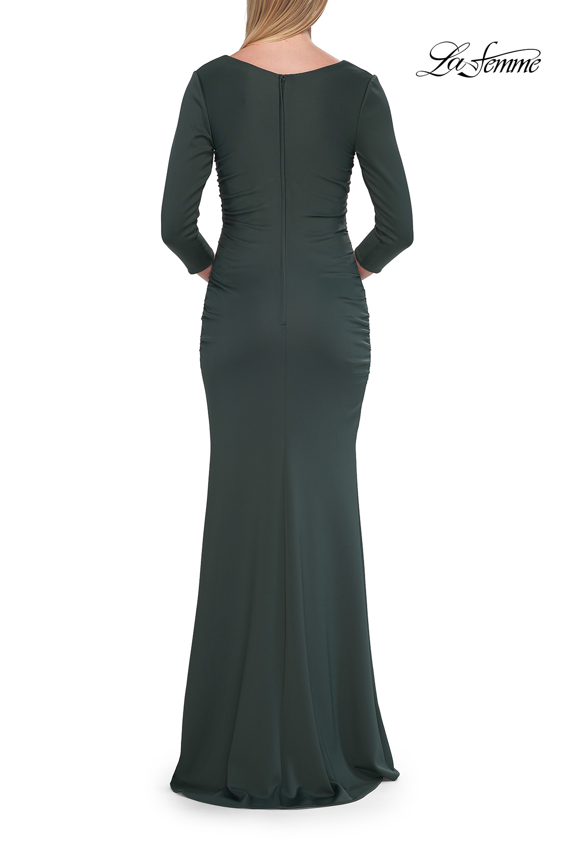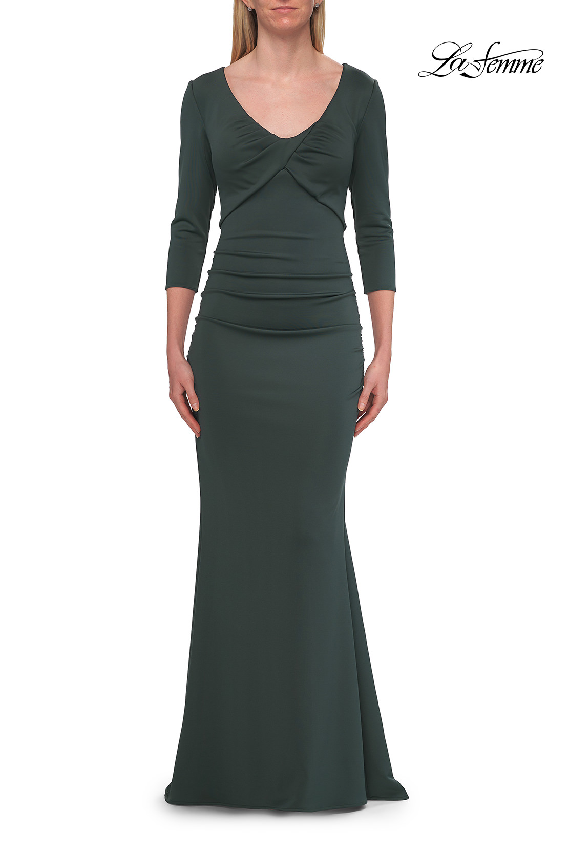 Sophisticated and effortlessly flattering, this fitted jersey gown features a soft V-neckline with gentle ruching that defines the waist. Three-quarter sleeves and a sleek floor-length silhouette create a timeless look ideal for formal evenings or special occasions. Back zipper closure.