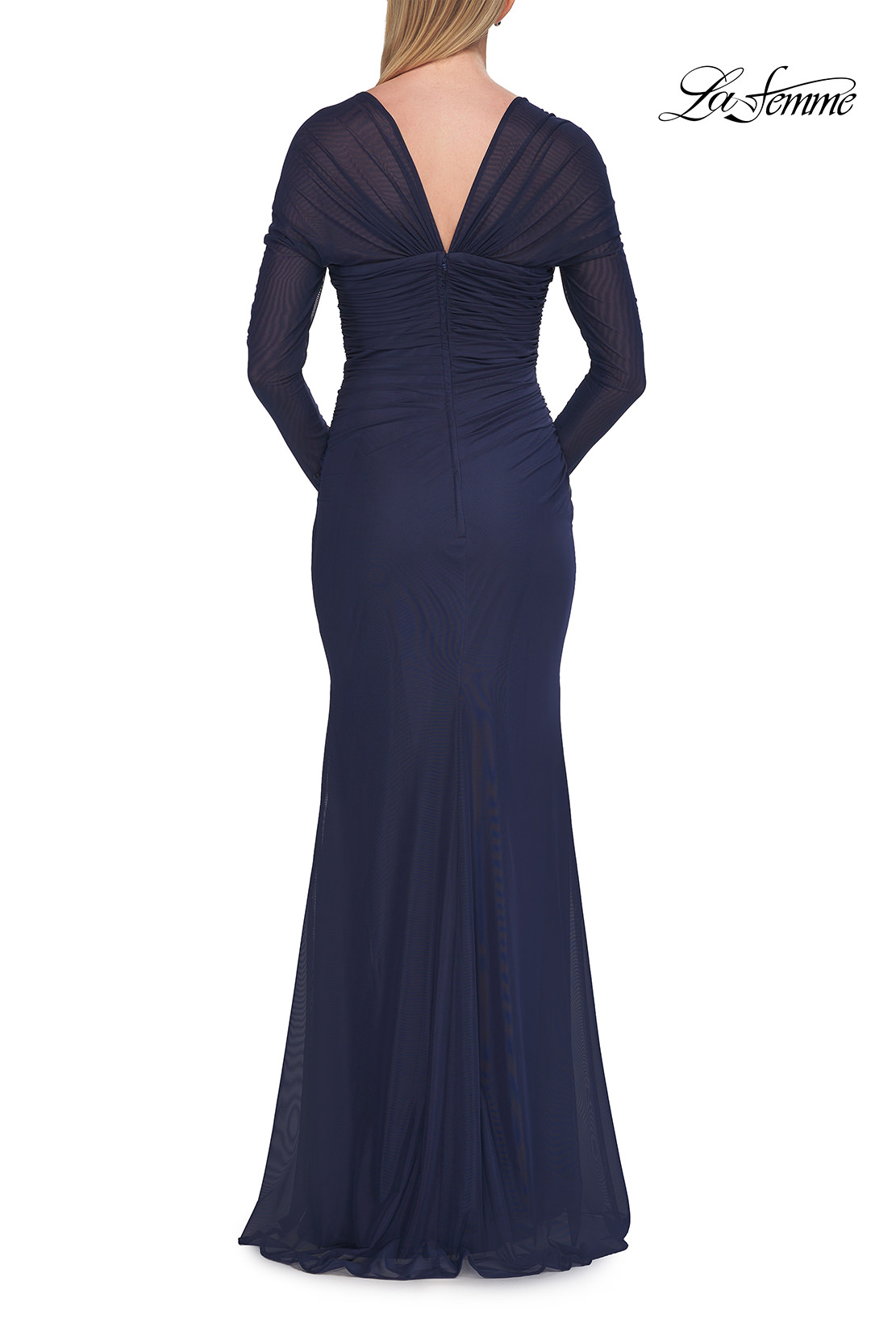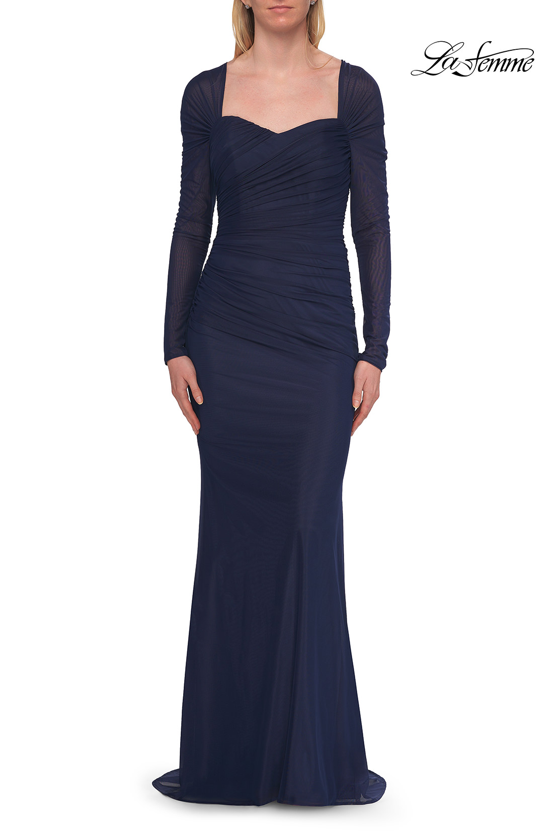 A timeless and elegant gown designed with a softly pleated bodice and sheer long sleeves. The sweetheart neckline and gentle ruching along the waist create a flattering silhouette, perfect for evening events or formal celebrations. Back zipper closure.