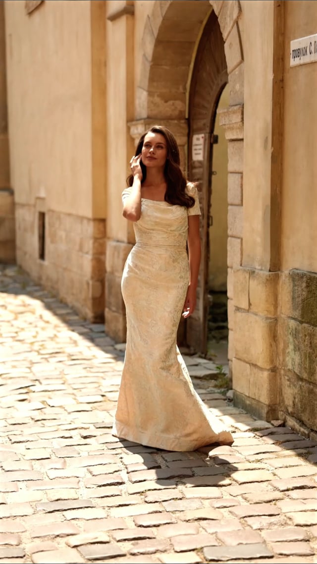 An elegant brocade gown featuring a structured square neckline and short sleeves. The fitted silhouette is softly ruched at the waist for a flattering shape, while the metallic floral pattern adds a refined touch. Back zipper closure.