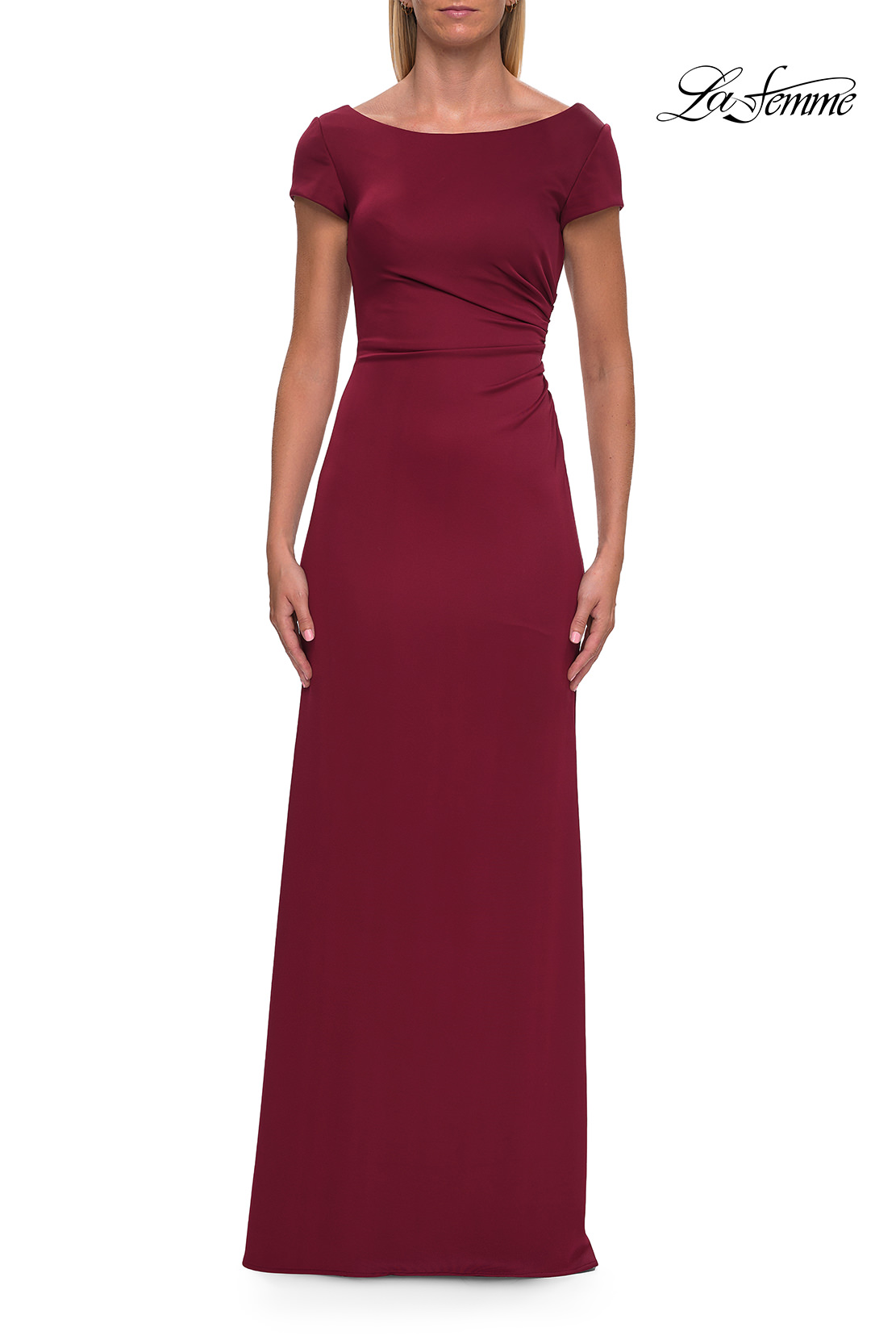 A simple yet refined gown designed with a smooth jersey finish and elegant short sleeves. Subtle side ruching enhances the waistline, while the soft scoop neckline and V-back create a timeless silhouette ideal for formal dinners, weddings, or evening celebrations. Back zipper closure.