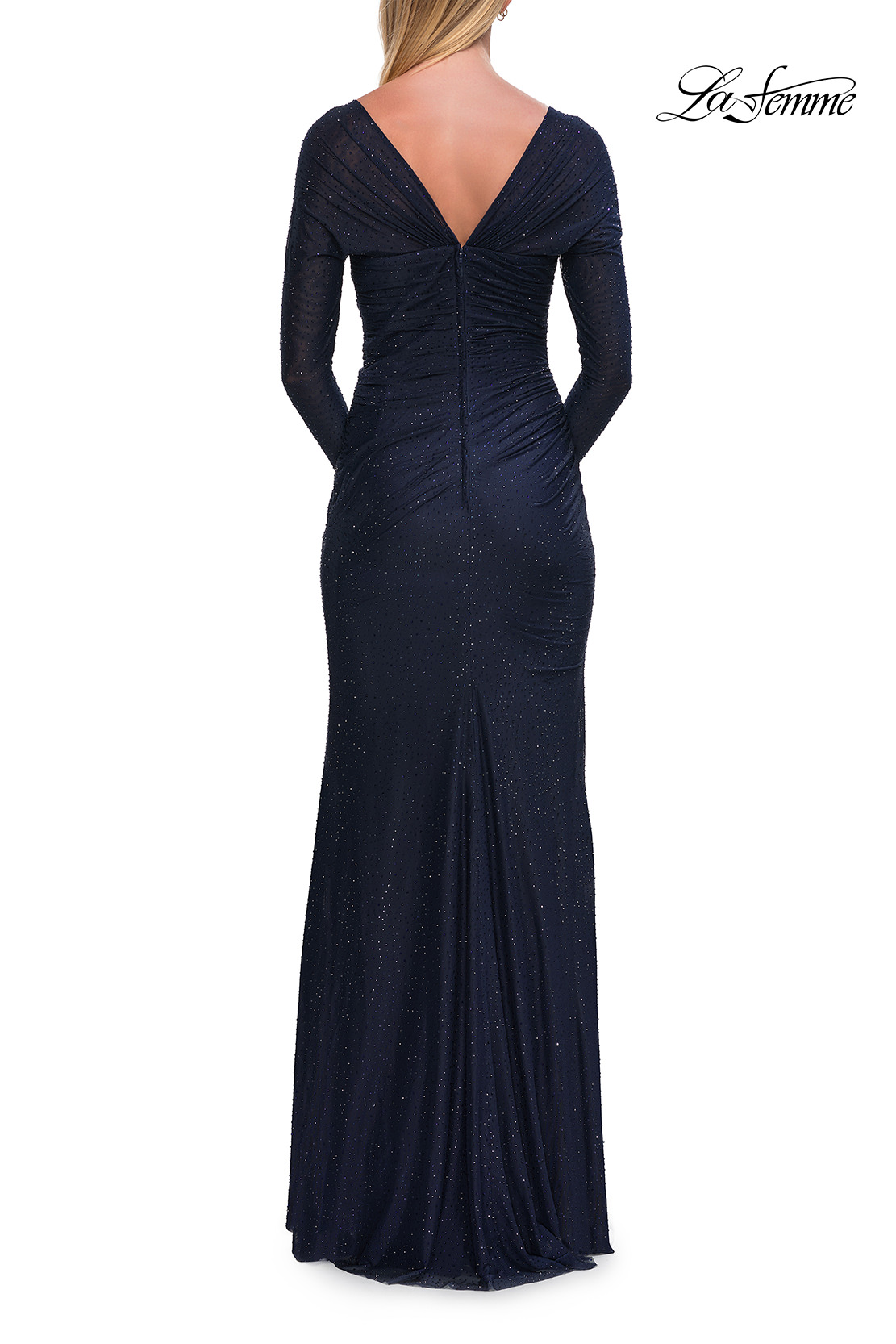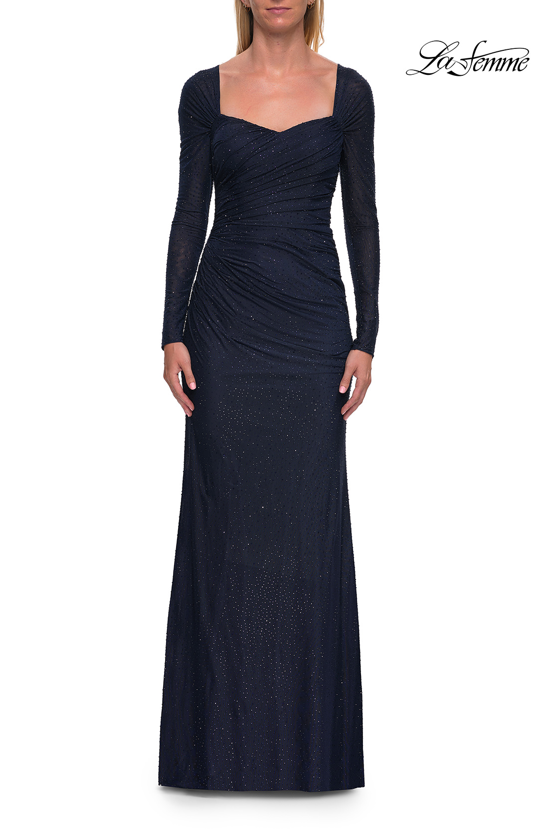 An elegant long sleeve gown crafted in rhinestone jersey for a subtle sparkle effect. The ruched bodice and fitted silhouette highlight the figure, while the sweetheart neckline and V-back add a touch of timeless sophistication. Back zipper closure.