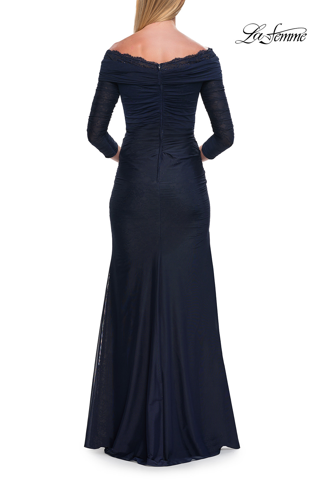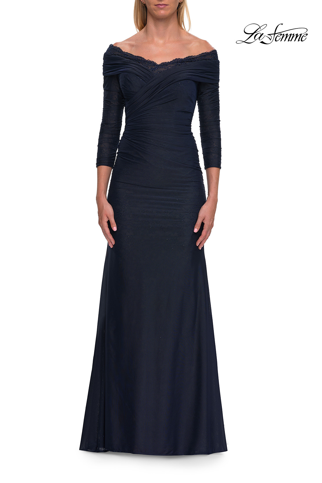 A refined evening gown featuring an off-the-shoulder neckline with delicate lace trim and ruched net jersey detailing over lace. The three-quarter sleeves and fitted silhouette offer a sophisticated balance of coverage and allure, making it perfect for formal events or elegant celebrations. Back zipper closure.