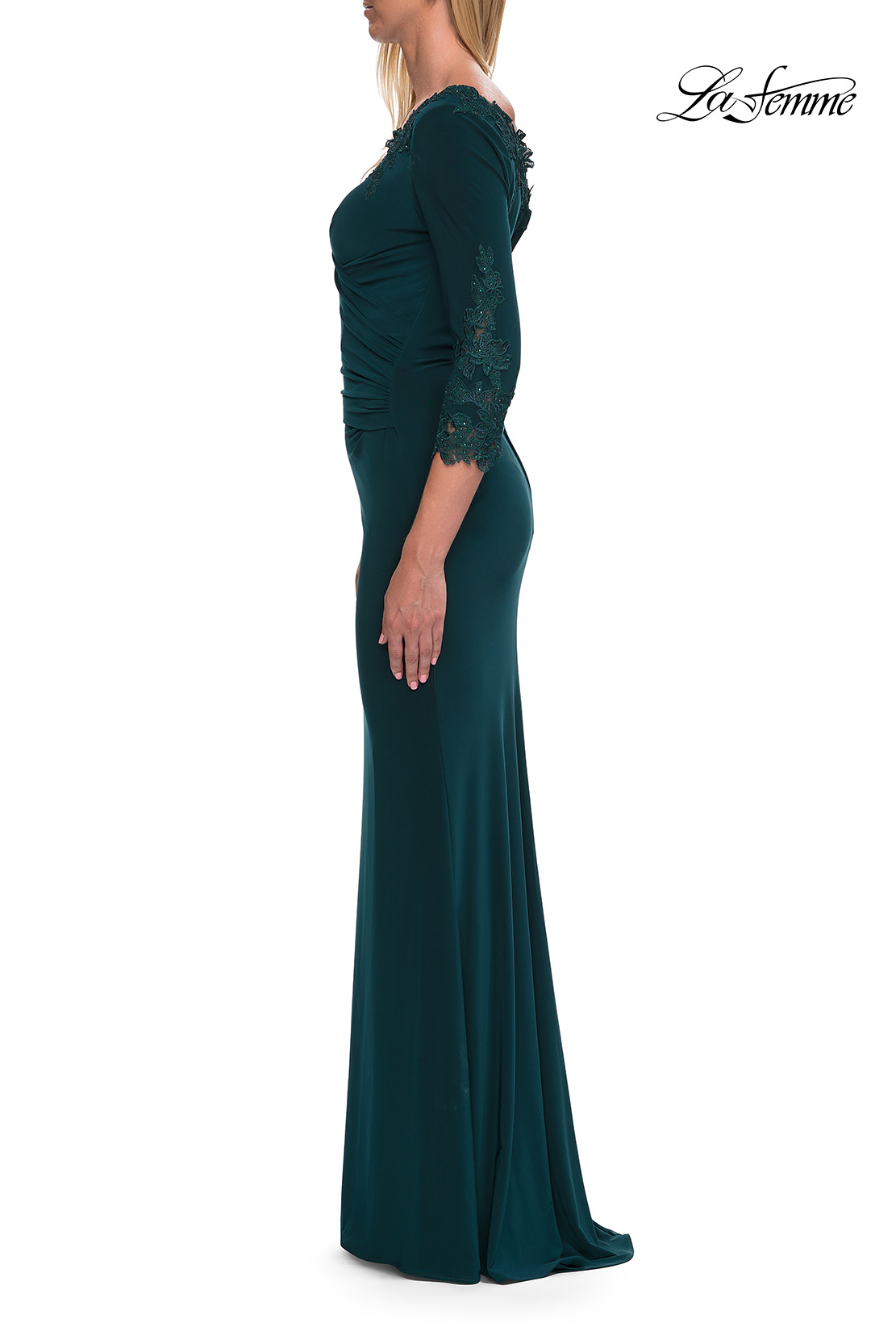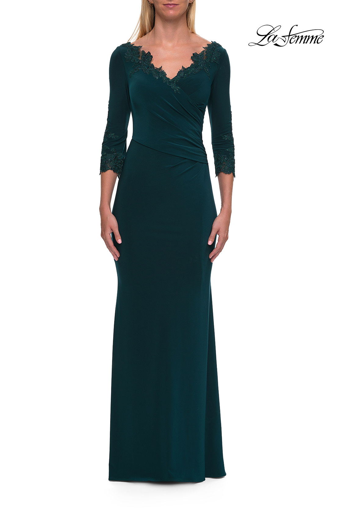 This timeless jersey evening gown features an elegant V-neckline adorned with lace applique trim that continues along the sleeves. The three-quarter sleeves and soft ruching at the waist flatter the figure, while the floor-length silhouette offers effortless sophistication. Back zipper closure.