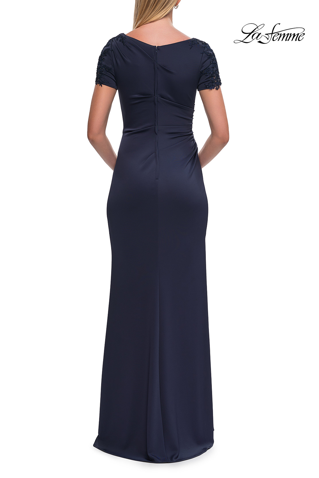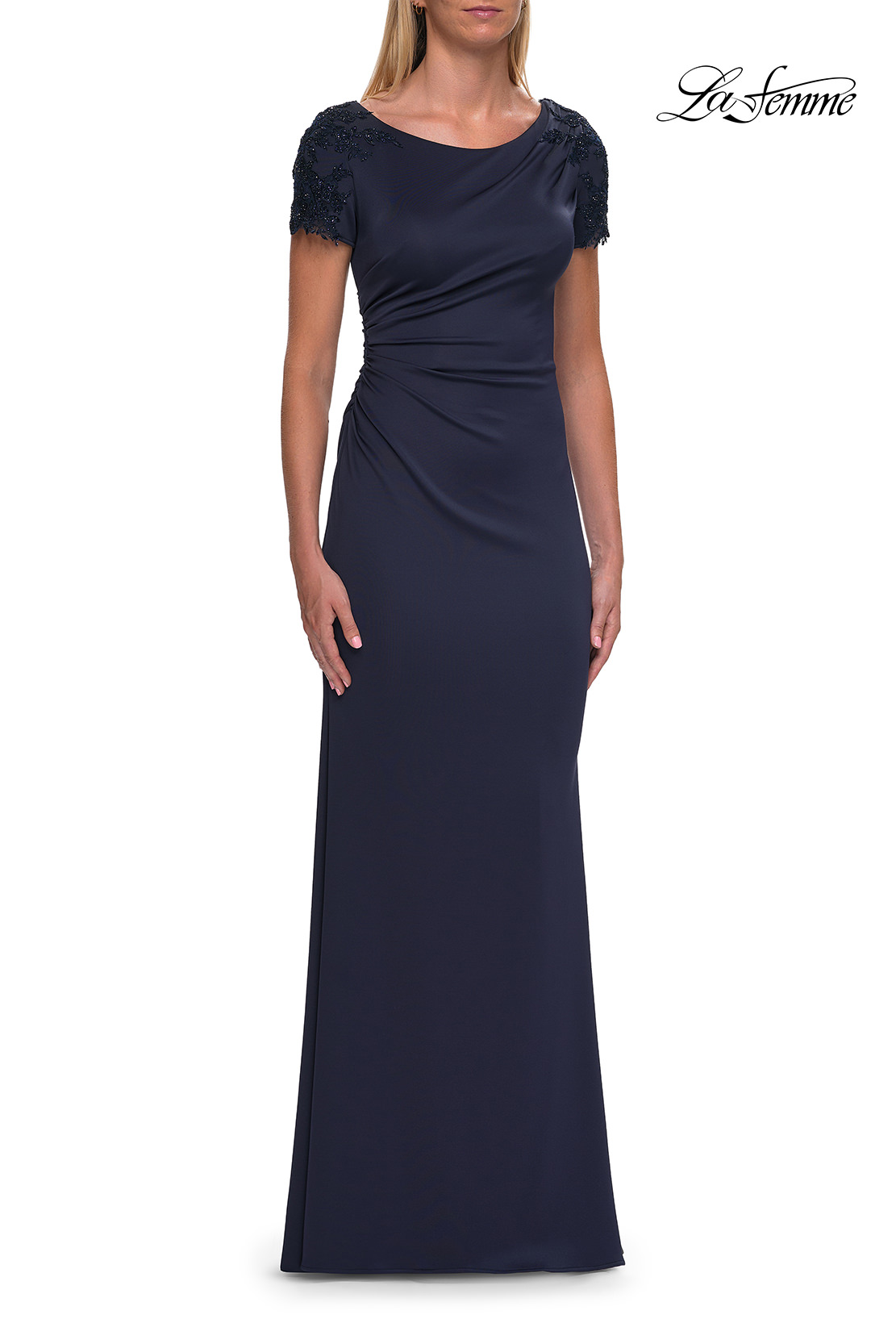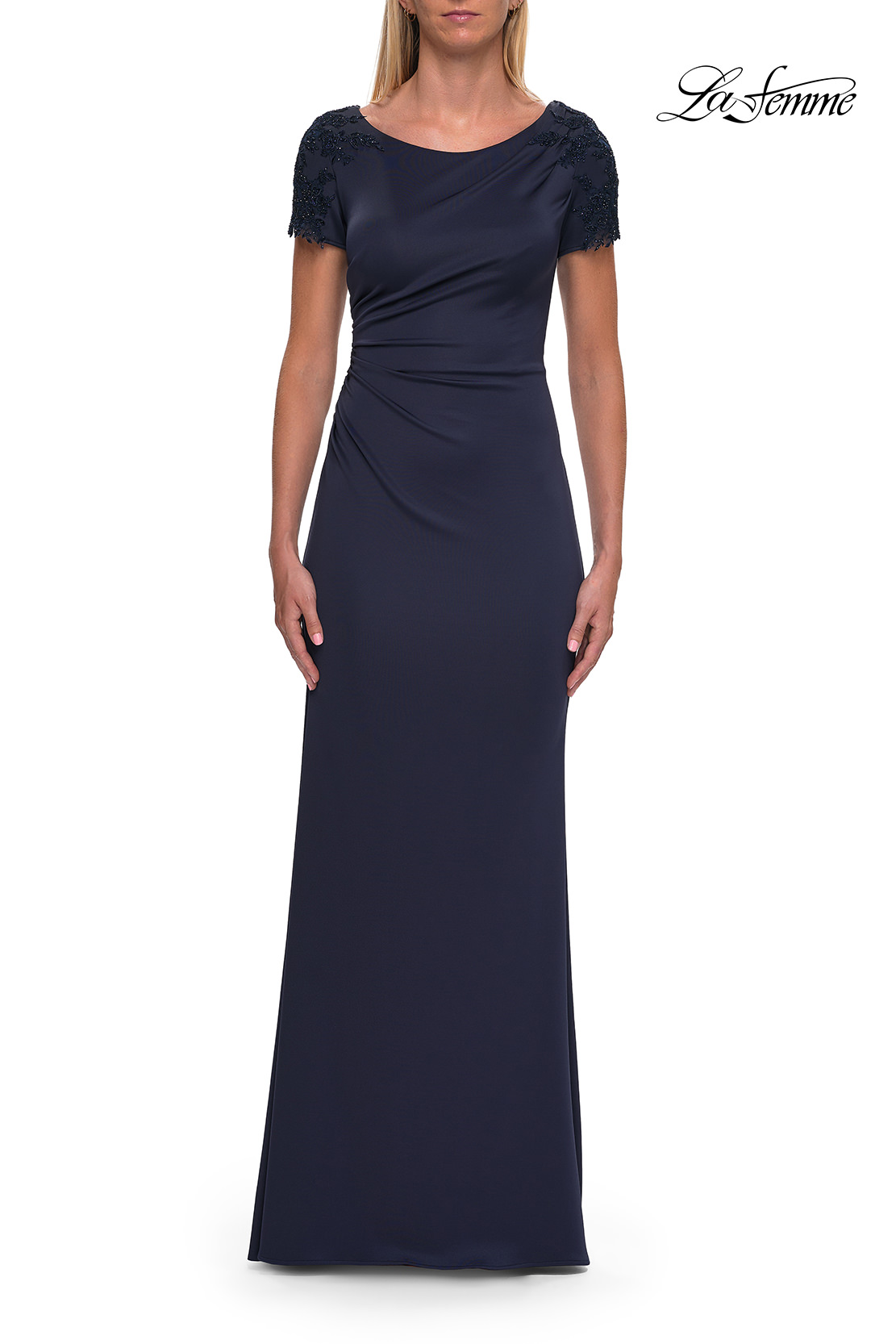 This sleek and sophisticated gown features elegant beaded applique detailing on the shoulders for a subtle touch of sparkle. Soft ruching at the waist flatters the figure, while the stretch fabric ensures a comfortable and graceful fit. Back zipper closure.