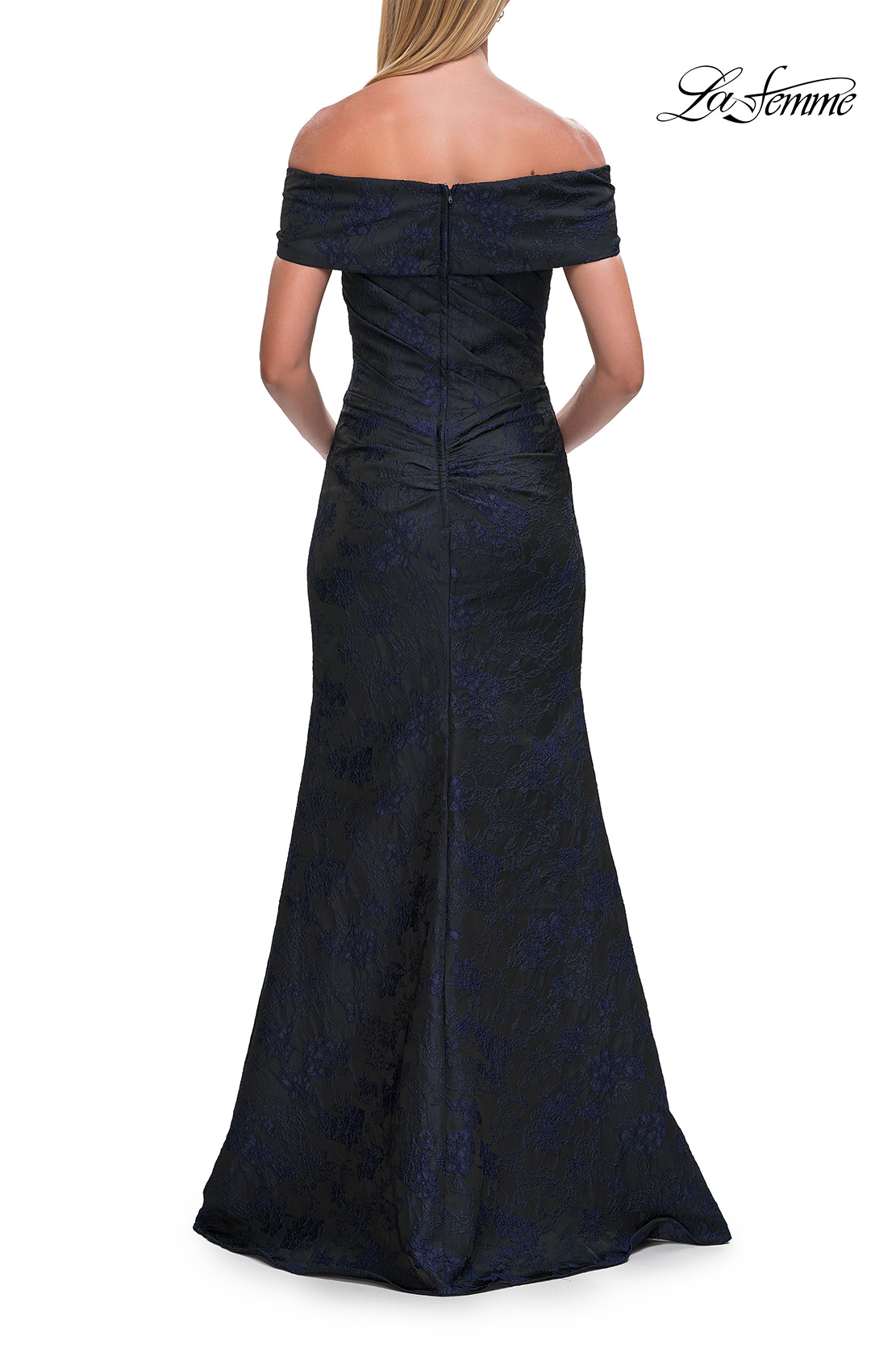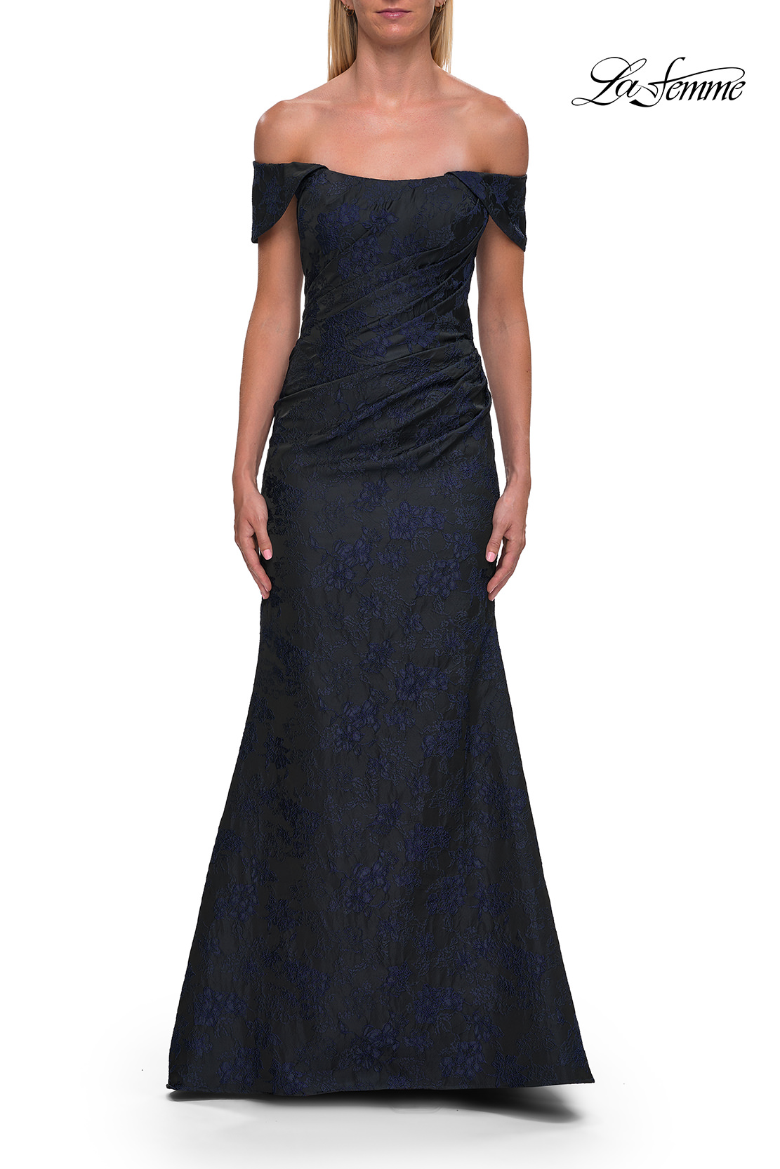 An elegant off-the-shoulder gown crafted from luxurious jacquard fabric with subtle floral texture. The fitted bodice features flattering ruching through the waist and hips, flowing into a softly flared skirt for timeless sophistication. Perfect for formal weddings, black-tie galas, or special occasions. Back zipper closure.
