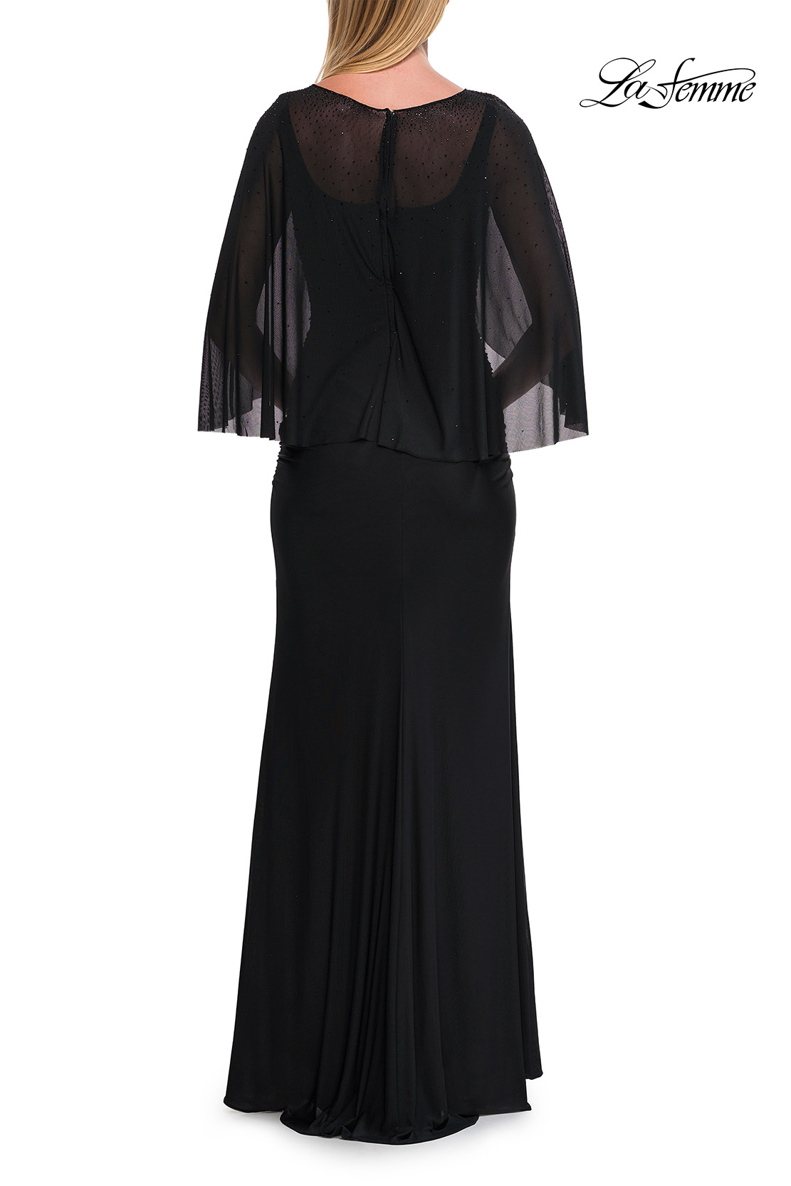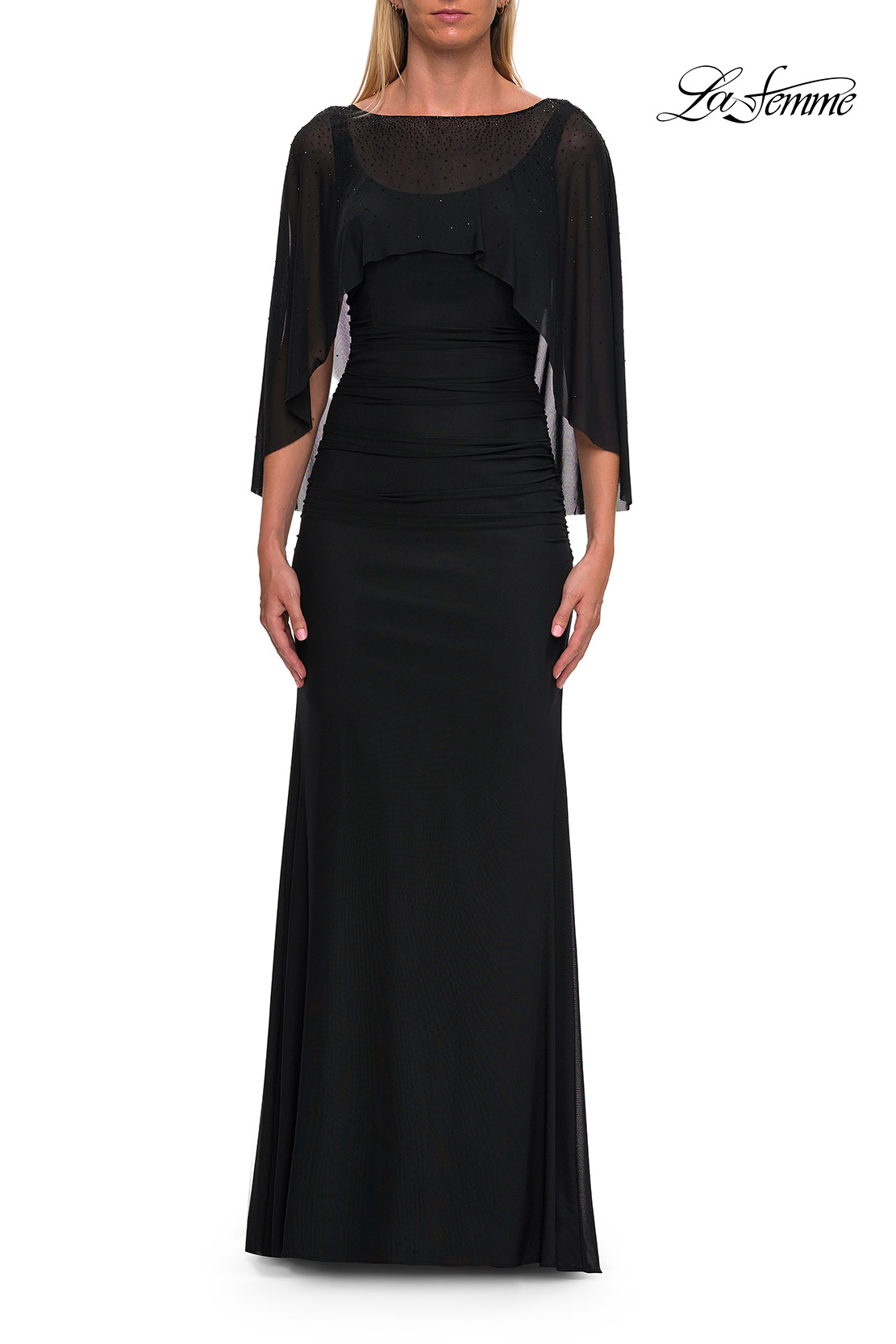 This elegant evening gown features a fitted jersey silhouette with flattering ruching and a flowing floor-length skirt. A sheer beaded cape overlay drapes gracefully over the shoulders, adding soft movement and sparkle. A timeless and modest choice for formal events or special occasions. Back zipper closure.