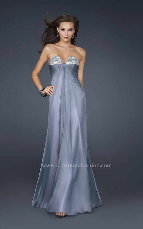 PREVIOUS STYLE NEXT STYLE LA FEMME 16970Size0 - 8 Size ChartColorLilac Share on FIND STORES NEAR MEA beautiful chiffon gown. Strapless, and encrusted with stones on the bust line.