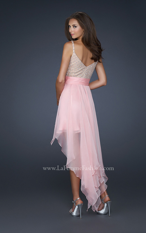 PREVIOUS STYLE NEXT STYLE LA FEMME 17732Size2 Size ChartColorYellow Share on FIND STORES NEAR MESexy V-neck spaghetti strap gown. With a waistband and a cascading high low hem.