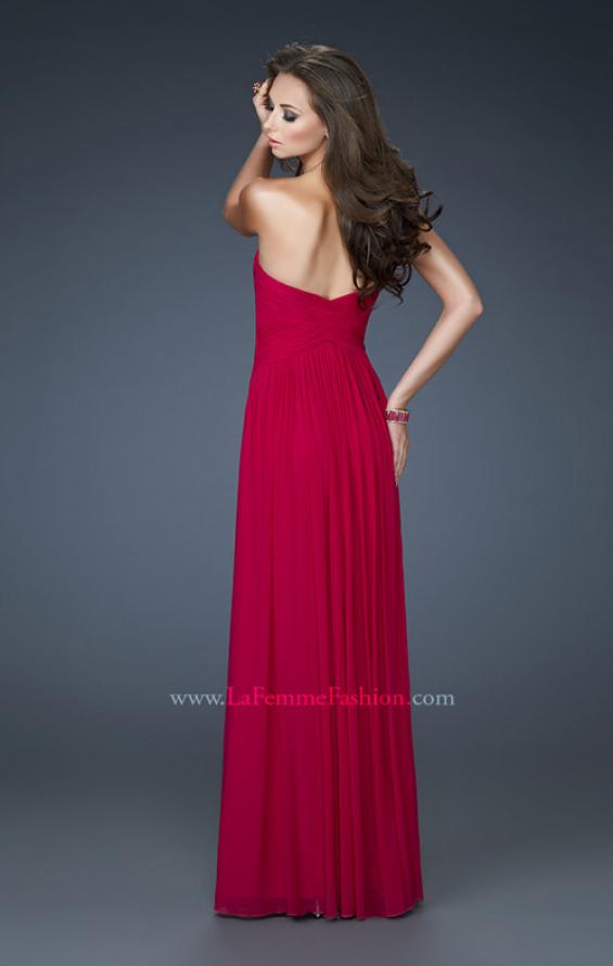 Strapless net gown with ruched bodice and sweetheart neck. Bust has an intricate woven basket weave design. Side zipper closure.