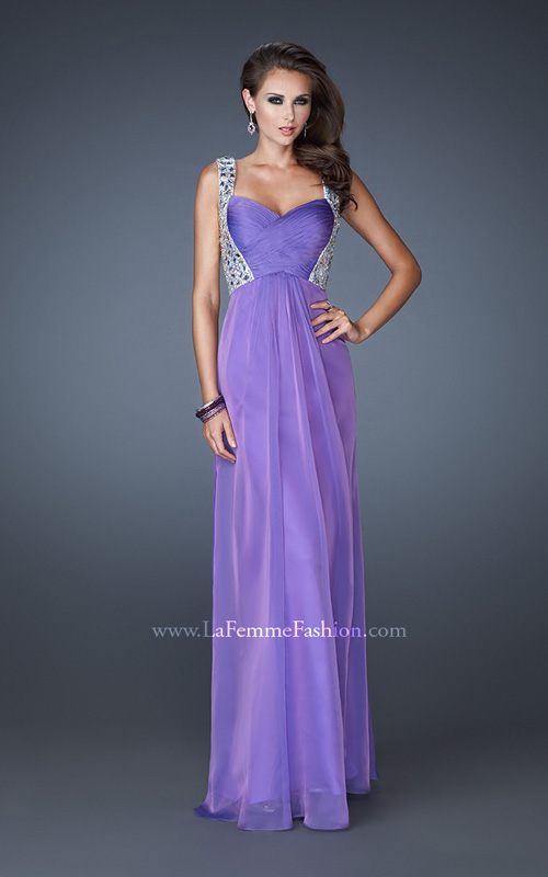 Sophisticated and gorgeous chiffon gown with Criss Cross gathered bodice. Large stones embellish the sides, straps and back. Side zipper closure.