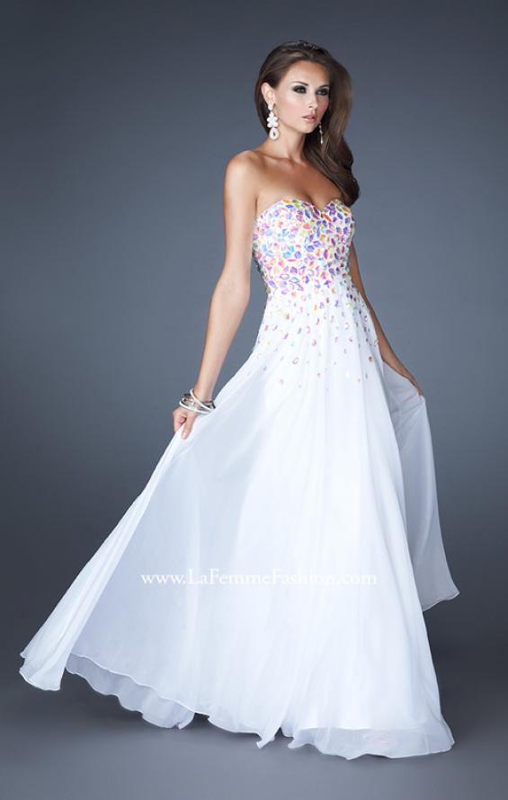 Amazing chiffon gown featuring a sweetheart neckline and chunky stones that adorn the bust and fade all the way down through the waist and onto the skirt. Side zipper closure.