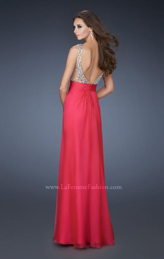 Two shoulder gown with delicate illusion straps that are sprinkled with AB stones. Criss cross front and V-back complete the look.