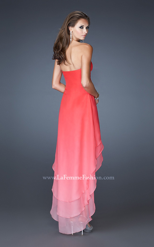 Feel elegant in this high low layered ombre chiffon dress. Strapless V neckline with center pleating that sweeps to the front hem. Side zipper closure.