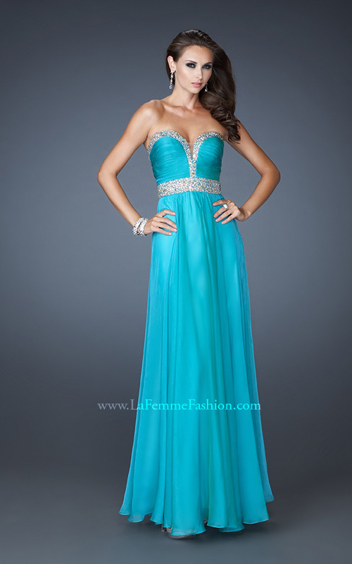 Enchanting chiffon gown with a strapless sweetheart neckline bordered with gems that continue to a plunging V-neckline with mesh insert. Dress has belted waist comprised of glistening beads and gathers on the front and back bodice. Side zipper closure.