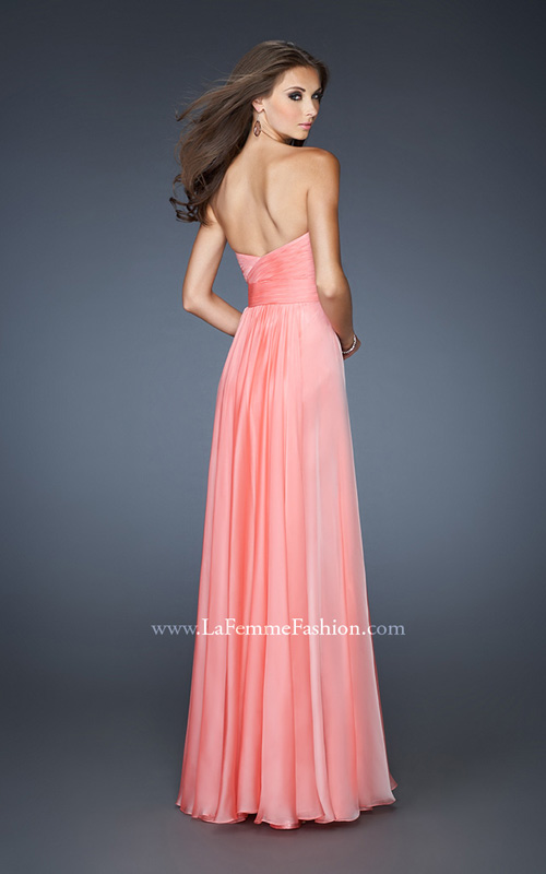 Chiffon A-line gown with modified sweetheart neckline that is elegantly beaded with stones across the neckline and Criss Cross pleating on the front and back of the bodice. Side zipper closure.