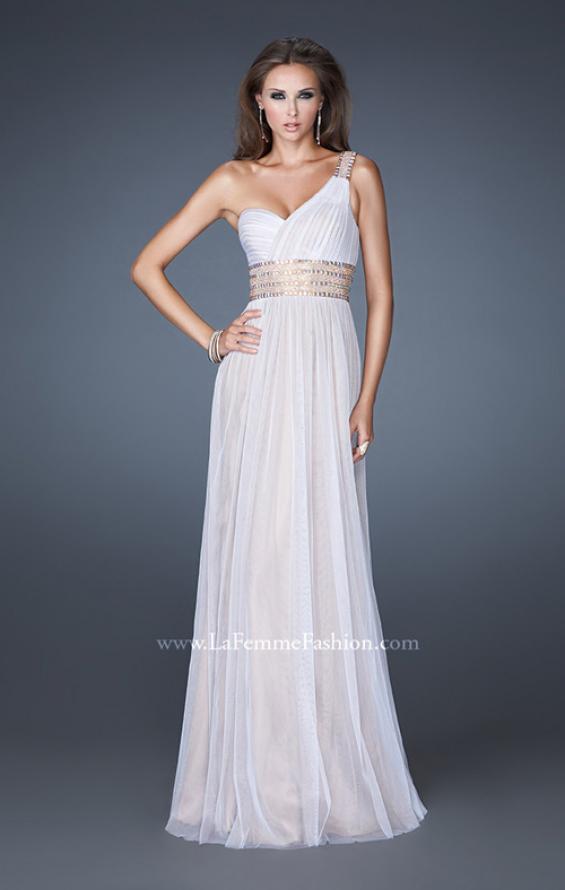 One shoulder tulle gown with gathered bodice and a beaded belt to accentuate the waist. Side zipper closure.